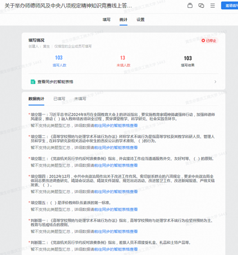 为进一步巩固拓展学习教育成果、锲而不舍落实中央八项规定精神、推进作风建设常态化长效化,同时,为进一步加强师德师风教育,引导学院广大教师坚定理想信念、厚植爱国情怀、涵养高尚师德,为推进强国建设积极贡献力量,2138CC太阳集团工会于2025年10月21日—24日举办了师德师风及中央八项规定精神知识竞赛线上答题活动。学院103名工会会员参加了活动。
