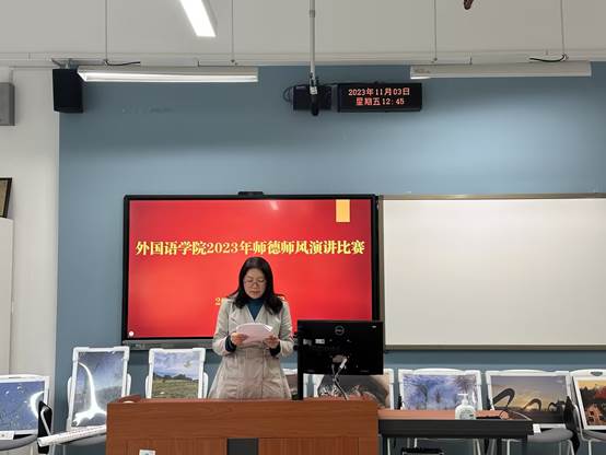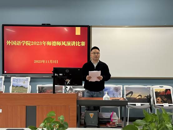 为深入学习贯彻习近平总书记关于师德师风的重要讲话精神,认真落实教育部等七部门《关于加强和改进新时代师德师风建设的意见》,全面落实学校党委关于师德师风建设的部署,进一步促进学院师德师风建设,外国学院工会于2023年11月3日中午举办了2023年教职工师德师风演讲比赛。