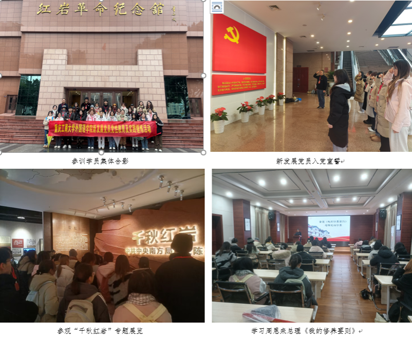全体参训学员在讲解员带领下,参观了专题展览——“千秋红岩”、草房旧址、饶国模故居、中共中央南方局暨八路军驻重庆办事处大楼旧址,重温了周恩来总理《我的修养要则》。活动中还举行了预备党员宣誓。