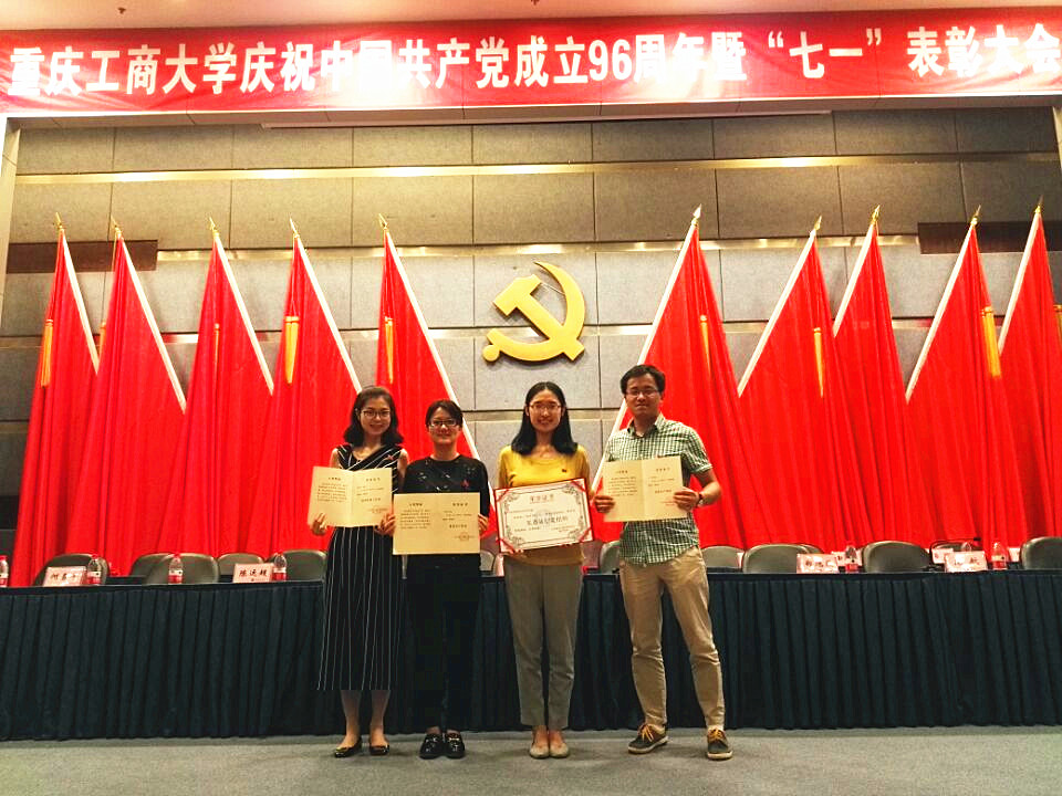 2017年6月28日,重庆工商大学庆祝中国共产党成立96周年暨“七一”表彰大会在博智楼7100学术报告厅召开。大会表彰了2016—2017学年先进基层党组织、党建工作专项奖、优秀共产党员和优秀党务工作者,并为30年以上党龄的党员代表颁发了纪念证书。我院学生党支部荣获先进基层党组织荣誉称号,刁洪和王露茜两位老师荣获优秀共产党员荣誉称号,陈丹杰老师荣获优秀党务工作者荣誉称号。