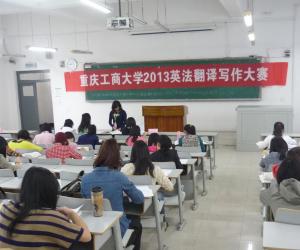 2013年10月26日上午,重庆工商大学2013英法翻译写作大赛决赛在博智楼07307成功举行。翻译决赛从8:30开始,9:30结束,写作决赛时间是10:00到11:00。本次活动由外语学院分团委学生会主办,权益部承办,体育部协办。