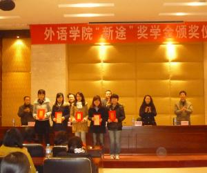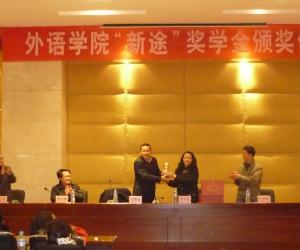 12月19日,重庆工商大学外语学院2012年新途奖学金颁奖仪式在田家炳书院408宣讲厅隆重举行。重庆新途进出口贸易有限公司董事长王敬春、重庆工商大学学生处副处长蒋年韬、外语学院党总支书记申卫东、院长李文英、副院长王恩科等出席颁奖仪式并为获奖学生颁奖。外语学院学团办各位老师、获奖同学及2012级全体学生参加了颁奖仪式。