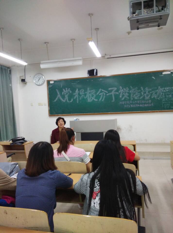 为了更系统、更充分地使入党积极分子学习中国共产党的先进科学理论,提高对党的认识,发挥积极的带头作用,外语学院南16A3党员服务站组织部于5月6日晚7:00在博智楼07209举办了本学期第一次“入党积极分子谈话”活动。外语学院张静丽老师作为本次活动的嘉宾与大一各班入党积极分子进行了谈话。