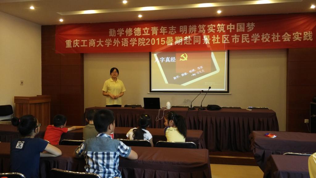 为了更好地学习贯彻党的十八大和十八届三中、四中全会以及习近平总书记系列重要讲话精神,重庆工商大学外语学院在为期5天的同景社区暑期社会实践中,将大学生社会实践与党建知识宣传紧密结合起来,通过多种多样的形式、丰富多彩的内容将党的基本知识带进小学生的课堂,对小学生进行爱国主义教育,培养他们的爱国主义情感。