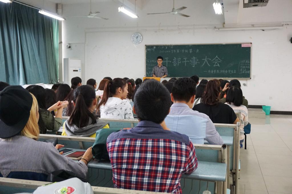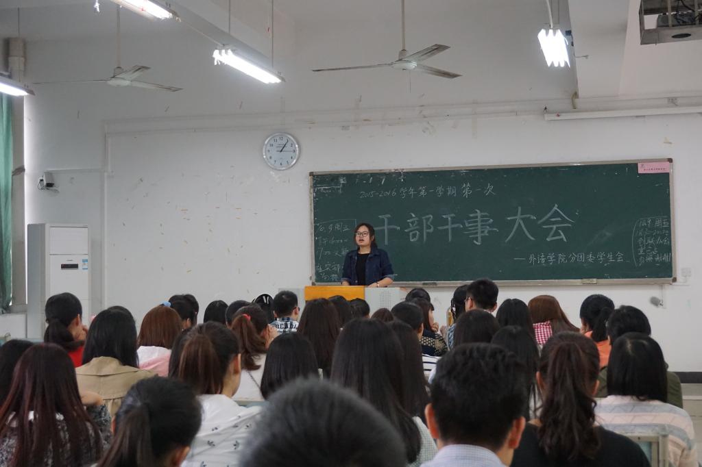 新学年新气象。为迎接和准备新学年的学生工作,2015年10月9日16:00,外语学院分团委学生会在兰花湖校区广智楼20313举行2015-2016学年第一学期第一次干部干事大会。外语学院分团委学生会副主席丁瑶瑶以及全体干部干事参加了此次大会。大会由副主席丁瑶瑶主持。