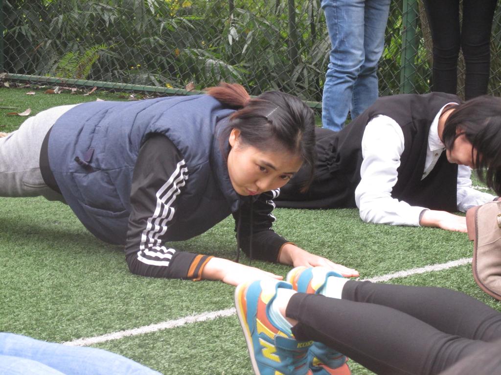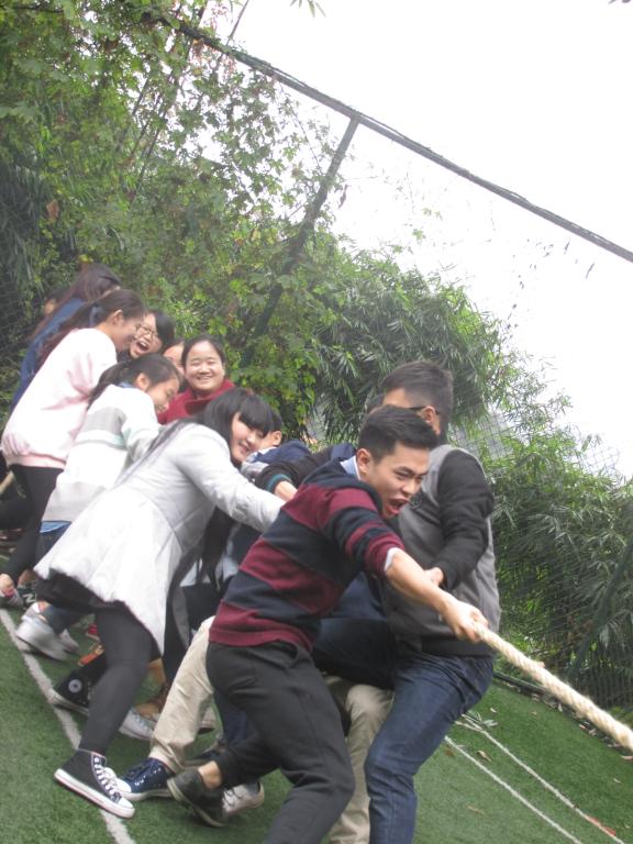 本次运动会共分为集体和个人两个大类,集体项目分别是:大力水手、扔沙包、这就是命、乒乓球接力,个人项目是平板支撑。14时整,活动在各班喊出气势磅礴的口号后拉开帷幕。第一个竞争项目是大力水手,各班各派出4男8女参加。赛前五个班的文体委员抽签,抽中红色的一队直接进入下一轮,另外四队两两PK。第二轮比赛由胜利的两队和落单的一队抽签,抽中红色的一队直接进入下一轮,其他两队PK,输方获三等奖。第三轮由第二轮赢方与抽中红色的队伍PK,评出一、二等奖。法语二班因两次抽签都抽中红色被冠以“运气王”的称号,与第二轮获胜的商英二班进行了激烈的角逐,虽然法语二班在前两轮中养精蓄锐,在决赛时蓄势待发,但还是输给了在前两轮中累积了大量经验的商英二班。最终,商英二班斩获了大力水手一等奖的桂冠。