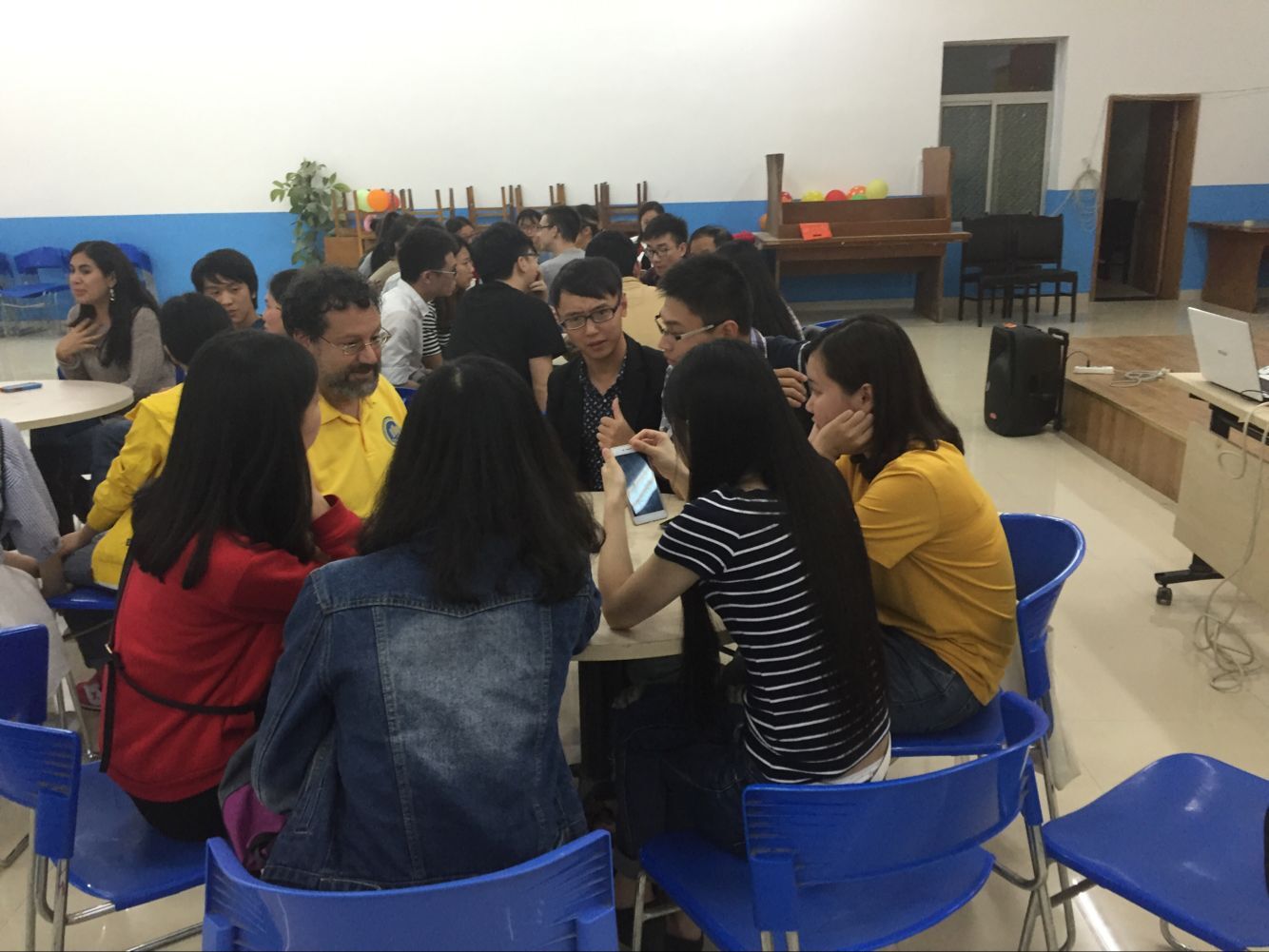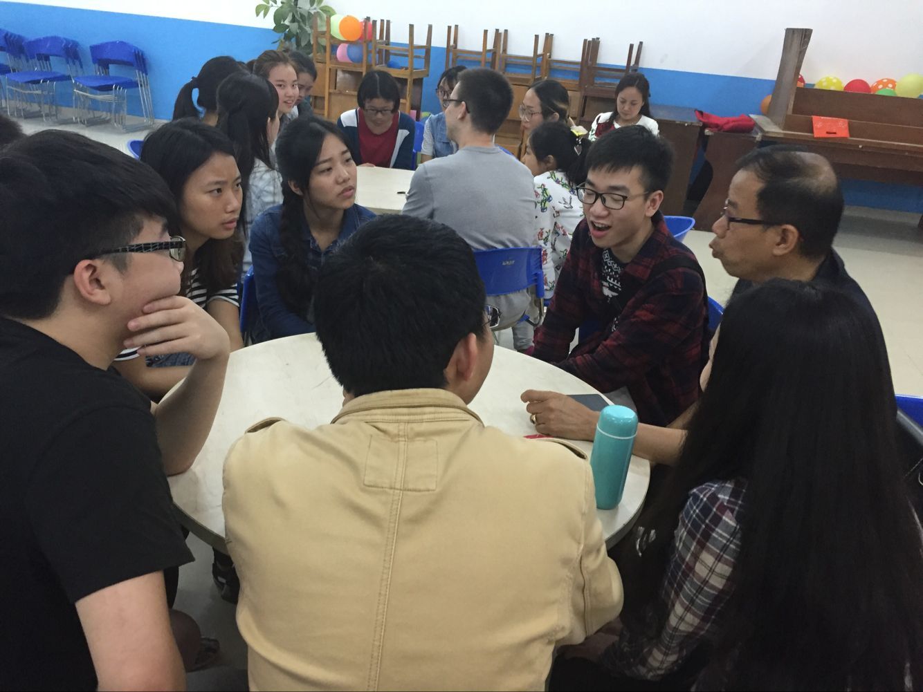 本次活动分为三个环节:第一环节由王丽丹同学通过PPT向大家展示一些童年的回忆,相似的童年经历引起了同学们的共鸣,现场气氛逐渐活跃起来。第二环节是问答环节,外教Justin与Anna同学的精彩有趣的对话,使得现场同学跃跃欲试,迫不及待的想要分享自己的童年轶事。随后便迎来了本次英语角的高潮——Free Talk。这是大家最喜欢的环节,讨论时“拼桌”、“换桌”、“凑桌”以及外教的“转场”,本次Free Talk的热烈由此可见一斑。大家各抒己见,纷纷讲述了自己的童年回忆,儿时有趣的游戏更是讨论得不亦乐乎。活动共持续了两个小时,在同学们不舍的“See you next week!”中,本次英语角圆满落幕。