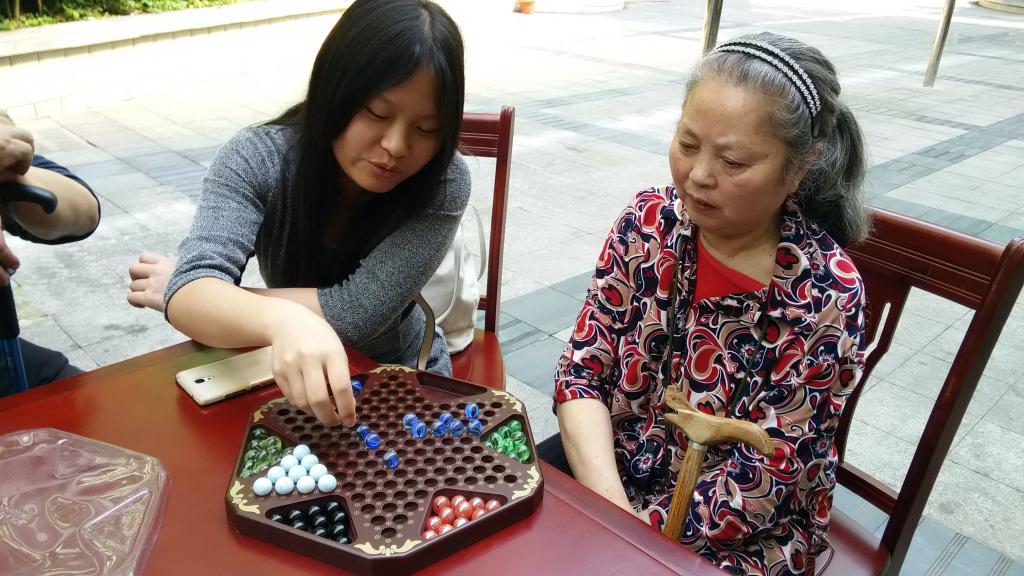 风带着丝丝凉意,阳光还未燥热,穿过黄桷树叶在地上投下斑驳的光影,此时是上午8点30。志愿者们带着零食、端午的慰问、怀揣着满满的温暖到达敬老院。简单的分工后,志愿者分成三组挨个房间为老人送去端午节的礼物。随后便是志愿者自由与老人交流的时间了。聊天、唱歌、下棋、玩游戏、散步...安静的小院因志愿者的到来而增添了一抹生机与活力。一位95岁的奶奶说:“同学们如此有爱心,以后肯定是国家的栋梁之才!”这样诙谐的言语逗得大家哈哈大笑。她还主动要求为大家表演自己的拿手绝活:唱歌!优美沧桑的嗓音下流转着熟悉的旋律、歌词,其他的爷爷奶奶们也忍不住哼唱起来,志愿者们为他们打起了拍子。这边歌声回荡,另一边也是“热火朝天”。一位略通棋艺的志愿者和敬老院的刘爷爷下起了象棋,两人不分伯仲,引来很多老人和志愿者的围观。一位精通棋艺的厨师爷爷在志愿者身后偷偷相助,刘爷爷渐渐处于下风,眼看“城门”即将失守,刘爷爷又是叹气又是求救,像想要棒棒糖的小孩一样可爱。老人们和志愿者们在心中连起了一座爱心筑的桥,欢声笑语充斥着整个敬老院,气氛融洽而不失温暖。