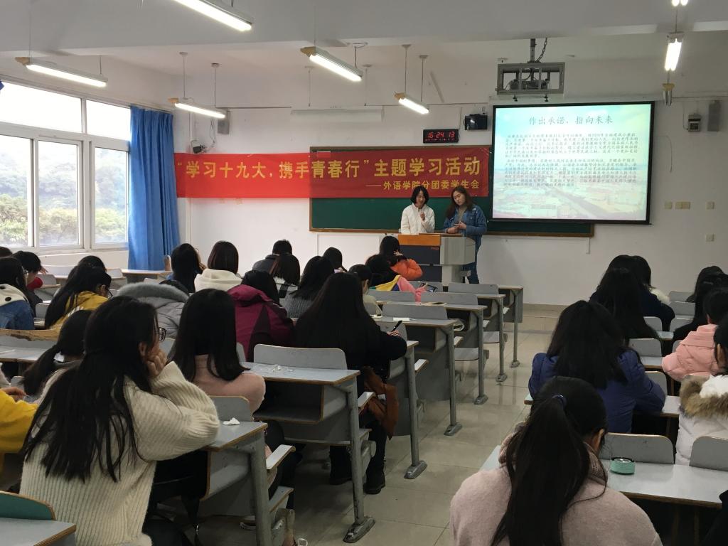 2017年11月24日下午4点,外语学院分团委学生会“学习十九大,携手青春行”主题学习活动在南岸校区07410圆满举行。本次会议由外语学院分团委副书记雷雨佳主持,学生会主席唐丽、副主席唐垒以及分团委学生会的全体干部干事们共同参与。