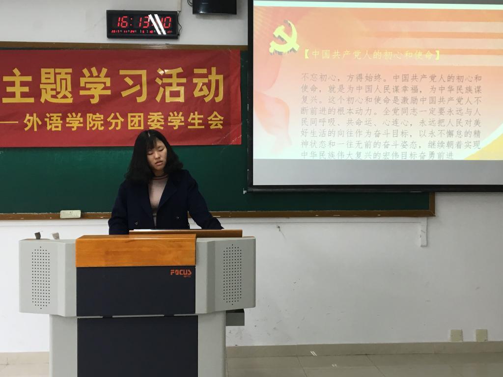 自十九大召开以来,外语学院的同学们通过不同形式进行学习,外语学院分团委学生会各个部门均开展了自学。在今天的活动中,各部门代表上台进行了十九大学习情况汇报。她们从“不忘初心,牢记使命”的十九大主题、“中国梦”的践行、中国实现富强民主的途径以及中国共产党自十八大以来取得的成就等方面阐述了本部门对十九大的理解和学习感悟。他们表示,十九大是全体中国人民都应关注的大事,是人民了解中国共产党和中国未来发展方向的主要途径之一。作为当代大学生应该认真学习领会十九大精神的核心要义和精髓,进一步坚定为实现中华民族伟大复兴的中国梦不懈奋斗的理想信念,要在生活和学习中不忘初心,积极奋进,努力提高自身科学文化素质和思想道德素质,争取成为一个无愧于党和国家,无愧于父母师长的当代人才,一个能够为祖国的未来更好发展贡献自己力量的国家栋梁。同时,各个干部也在此次活动中体悟到,作为学生干部,更应在各个方面起好带头作用,不忘初心,积极创新学生会管理方法和运作流程,发挥团员青年表率作用,为实现伟大复兴的中国梦不断贡献我们的青春力量。