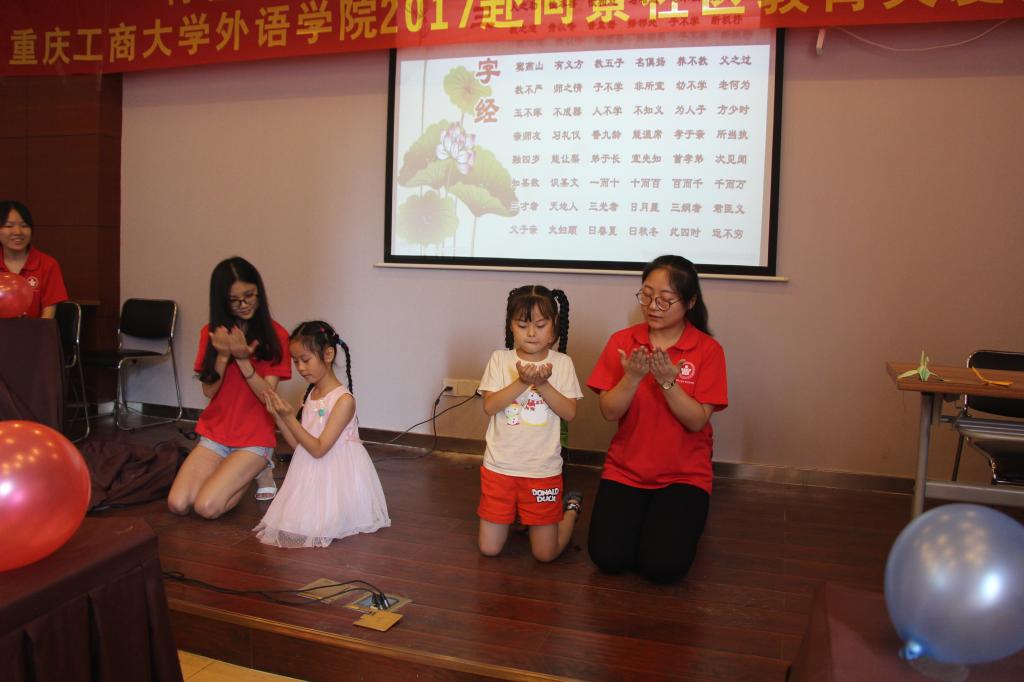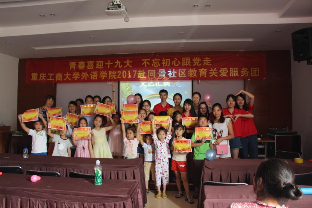 2017年7月21日,重庆工商大学外语学院暑期社会实践的志愿者在同景社区工作人员的积极配合下举行了文艺汇报演出。尽管经过几天来回路程的颠簸,但是志愿者们依旧是满怀期待地准备汇报演出。