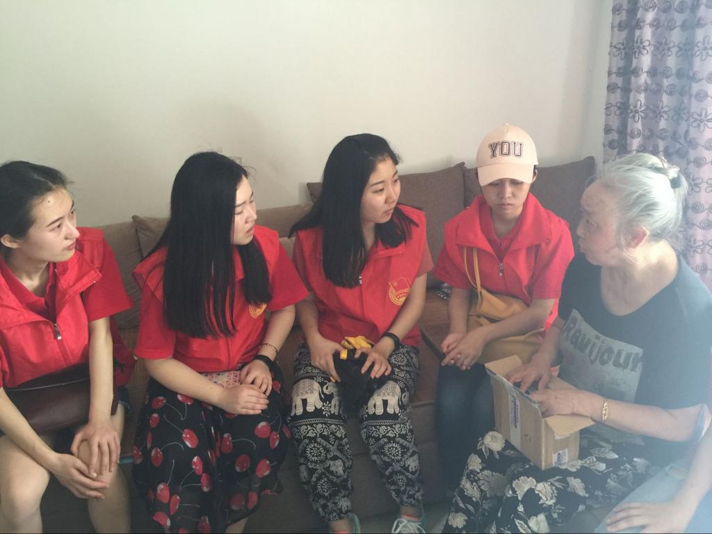 为进一步继承和发扬“敬老爱老”的光荣传统,志愿者们还开展了“敬老爱老 关爱到家” 慰问社区老人的志愿活动。19日上午,外语学院的志愿者们带着水果、牛奶等慰问品,看望了大堰社区生活贫困的两位老人,并和老人一起聊天,详细询问老人的生活情况和身体状况,给老人送去了教育关爱服务团的一份爱心,一份温暖。