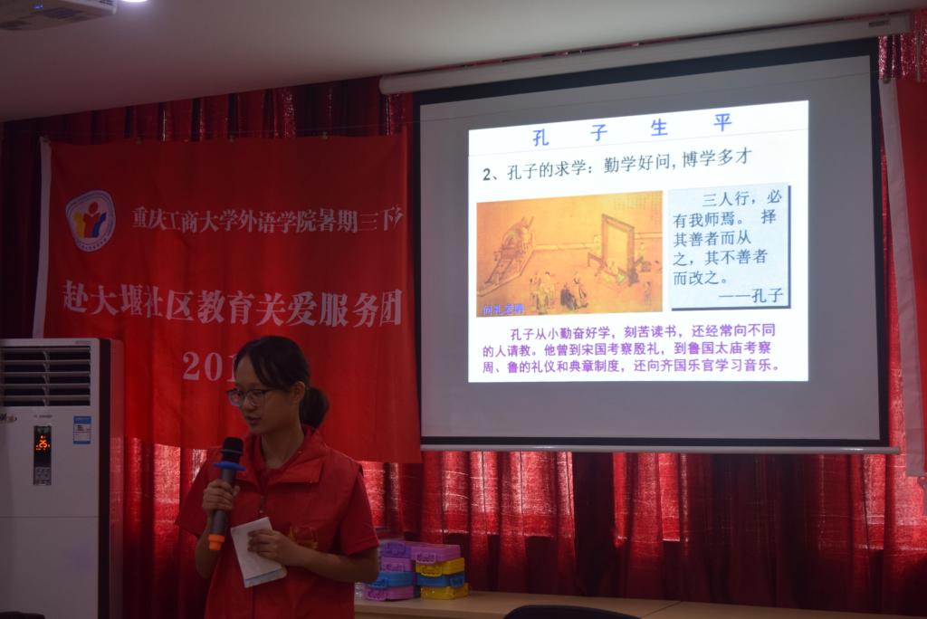在过去的一个星期里,外语学院的志愿者们分别在大堰社区、同景社区针对当地小朋友们开设了一些列生动有趣的课程:在“外语课堂”里:通过中外谚语比较、单词学习、学唱英文、法文歌等提高了小朋友外语学习的兴趣;“传统文化课堂”中志愿者给小朋友安排了中国传统经典作品鉴赏课,除了《百家姓》、《孔子》、《三字经》、《弟子规》此类中国小朋友启蒙教育经典读物之外,还包括了中国四大名著之一的《西游记》以及法国的《小王子》,这些课程通过视频、PPT等生动的形式展现出来,深受社区小朋友们的欢迎;志愿者还带领社区小朋友们开展了手工制作皮影、宫灯,猜灯谜等手工课,让小朋友们了解了皮影、灯谜等传统民俗,通过下象棋、功夫,让小朋友们开拓了眼界;志愿者通过和小朋友们一起制作京剧脸谱,西方歌剧和中国传统京剧的对比让小朋友了解了博大精深的国粹。志愿者还将中外文化知识进行了对比,中外传统礼仪、中外传统饮食文化、中外传统服饰欣赏、中外传统节日等课程深受社区小朋友的欢迎。此外,队员们还开展了调查问卷发放、慰问家庭贫困老人的志愿服务活动。