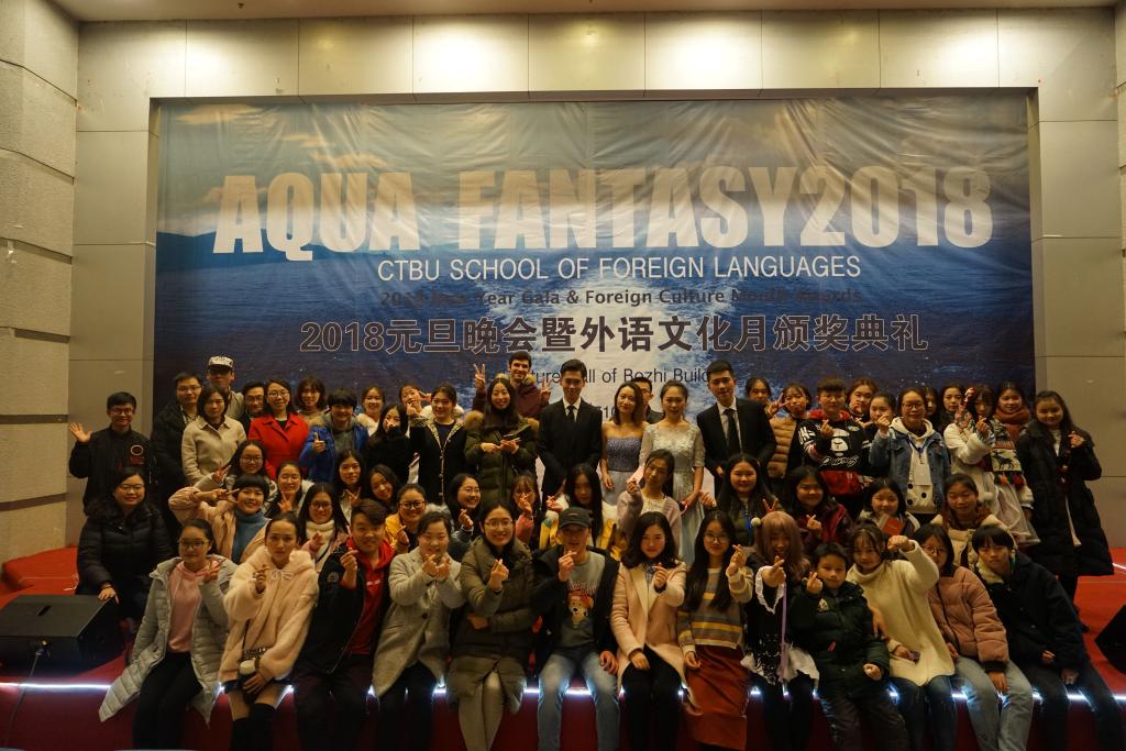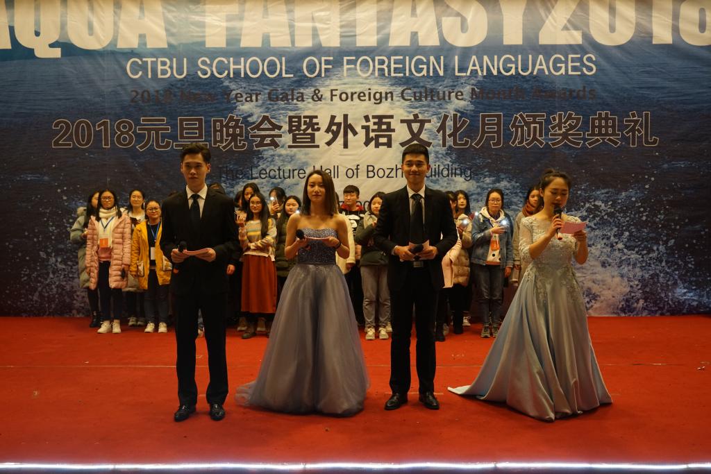 2017年12月30日晚18点30分,由重庆工商大学外语学院主办、外语学院分团委学生会承办的2018年元旦晚会暨外语文化月颁奖典礼在南岸主校区7100报告厅成功举办。重庆工商大学外语学院副院长周琳教授、外语学院党总支陆嘉书记、外语学院英语系主任邹莉老师、外教Jonathan受邀出席晚会,全校各兄弟组织主席团也受邀参与了此次活动。
