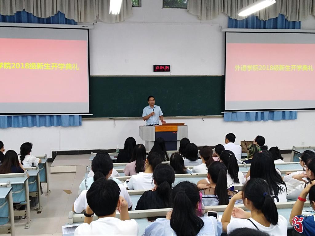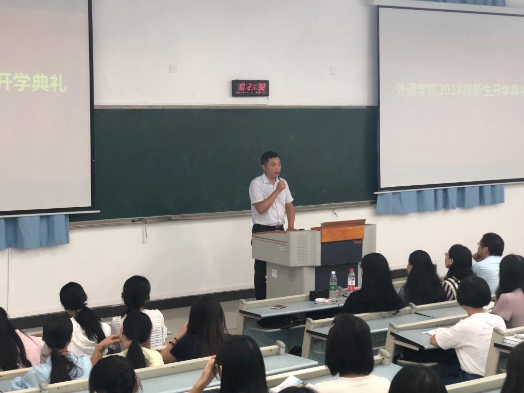 典礼上,戴运财院长首先代表外语学院全体师生对2018级新生的到来表示最热烈的欢迎!他从学院发展历史、师资力量、教学成果、育人成果等方面介绍了外语学院的基本情况,并提出了四点要求和希望:一是希望同学们树立远大的理想、确立人生的奋斗目标;二是希望同学们持之以恒、努力学习(考研);三是希望同学们努力提高综合素质,做一个德智体美全面发展的人;四是希望同学们处理好学习与其它事项的关系。接着,陈晓东书记做了讲话,他分享了自己的成长经历,勉励同学们要珍惜青春年华,要强健自身体魄;要有责任心,宽容心和集体意识;要努力学习专业知识;要以社会主义建设者和接班人的使命担当,为全面建成小康社会、全面建设社会主义现代化强国而努力奋斗,让中华民族伟大复兴在我们的奋斗中梦想成真。