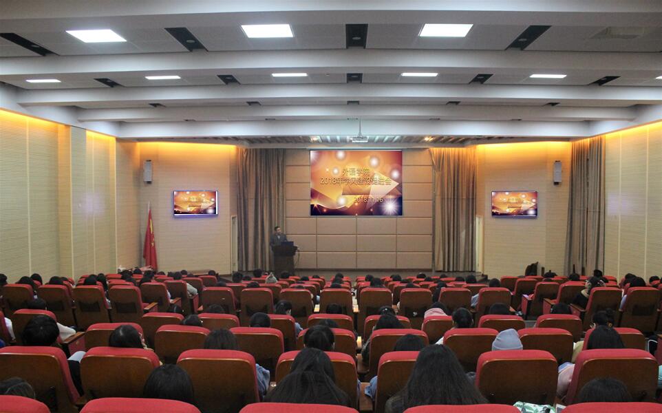 大会共七项议程。戴运财院长针对学风建设进行了详细的讲解,他指出,正确认识学习的价值、明确学习目的并努力达到学习目标是营造良好学习氛围的关键。周琳副院长宣读了2018年外语学院学生先进集体和先进个人的表彰决定,学院领导为获得学年标兵的个人和集体,优秀学生代表以及各项专业竞赛获奖个人和集体颁奖。优秀学生代表杨爽、竞赛获奖学生代表董浩、邓雅心相继进行了发言,她们分享了自己在学习生活中的感悟,鼓励在座的同学们热爱所学专业、学习上勤奋努力,不断挑战自我、增强自信心;通过参加专业类比赛来检验和提高自己的专业学习,通过竞赛相互学习,弥补差距。随后,外语学院党总支副书记程亚对学院各年级2018年学业成绩报告进行了分析。外语学院法语系主任曹鹏、英语系主任邹莉、教师王佳、张冉对外语类各项专业竞赛进行了介绍。最后外语学院党总支书记陈晓东表示,优良学风有助于提高人才质量、帮助学生树立正确的人生观、价值观、世界观。对此,他提议应利用好课堂、第二课堂、图书馆和宿舍四个阵地,既要扎实基本功,也要提高创新能力。