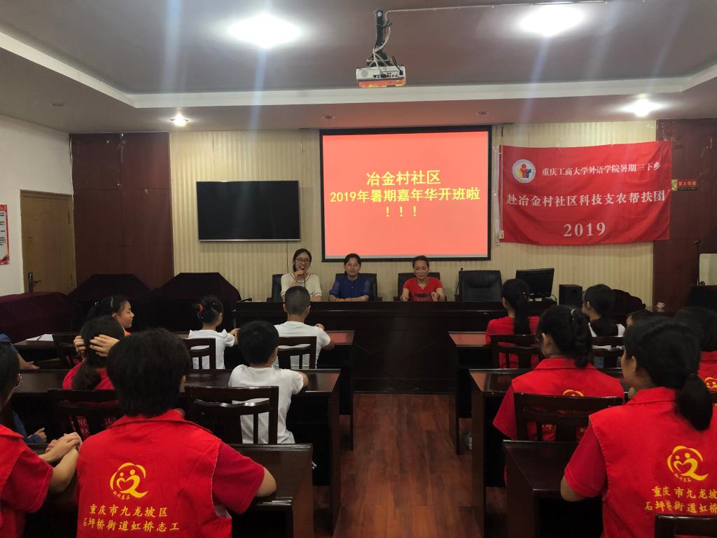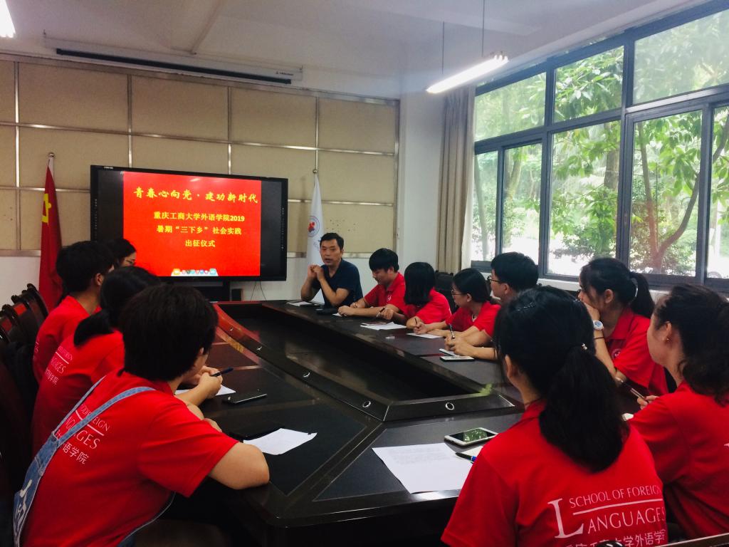 重庆工商大学外语学院2019年暑期“三下乡”--赴九龙坡区石坪桥街道冶金村社区社会实践活动正式拉开了帷幕。7月5日,实践活动出征仪式在田家炳203会议室举行。外语学院党总支书记陈晓东、党总支副书记程亚、分团委书记黄志婕及本次实践活动的全体志愿者参加了出征仪式。