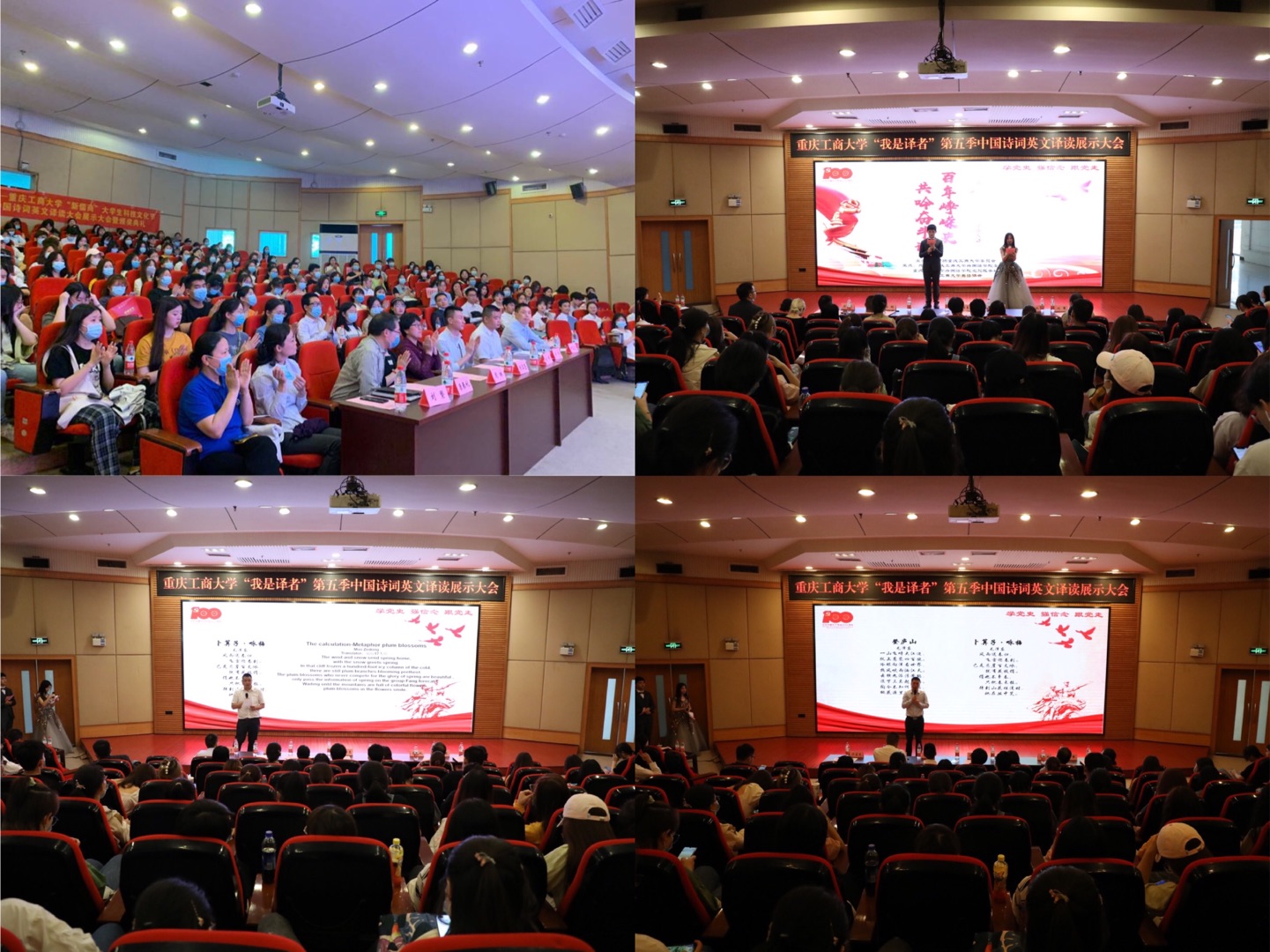 2021年4月30日下午,由共青团重庆工商大学委员会主办,2138CC太阳集团分团委学生会、2138CC太阳集团党员服务站、英语协会联合承办的“百年峥嵘史,共吟奋斗诗”第五季中国诗词英文译读展示大会暨颁奖典礼在南岸校区7200教室成功举行。重庆工商大学党委学工部副部长陈亚惠、校团委老师陈琛、2138CC太阳集团党委书记唐春秋、院长周琳、党委副书记吴欢欢、副院长刘繁、分团委指导老师丁亮,以及来自全校不同学院近300名同学参加了本次活动。本次活动首次采取双导师点评的方式,2138CC太阳集团英语系向鹏老师从专业角度点评翻译技巧和意境,马克思主义学院中国近代史纲要教研部主任洪富忠老师为同学们讲解党史诗词的背景和历史故事。
