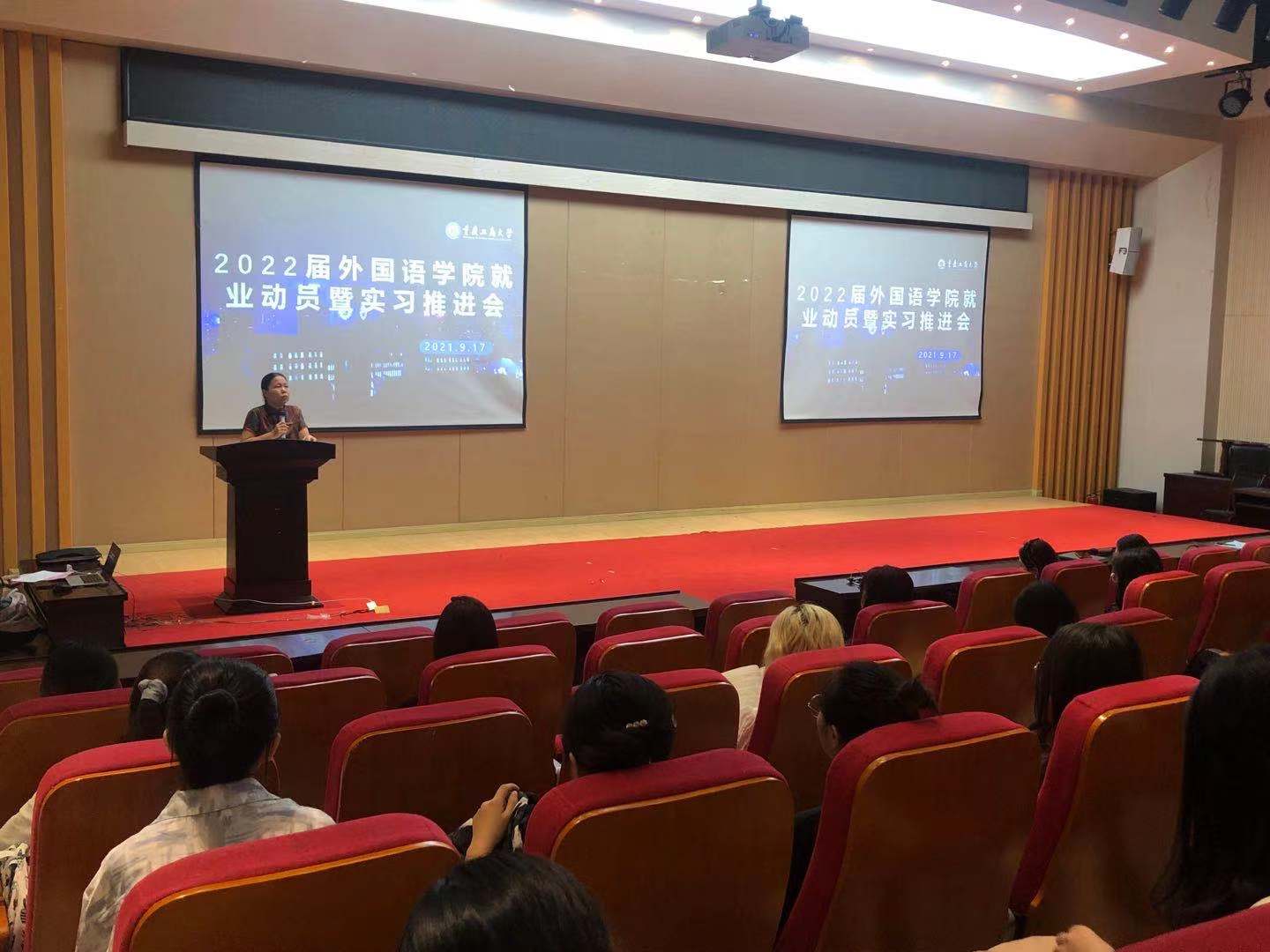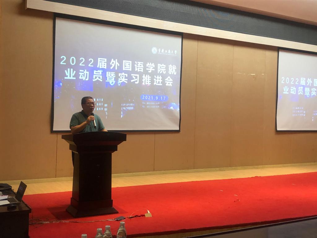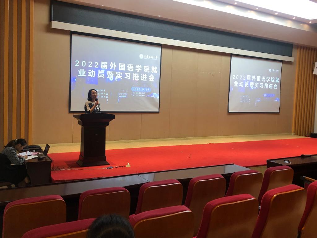 2021年9月17日,2138CC太阳集团在田家炳209举办了外国语2022届就业动员暨实习推进会,根据疫情防控要求,此次大会分为商务英语专业、英语法语专业两场举行,由学院辅导员黄颖婕主持,2138CC太阳集团党委书记唐春秋、院长周琳、副书记吴欢欢、英语系主任邹莉、英语系副系主任宋敏子、法语系主任曹鹏以及2022届全体学生参加了本次会议。