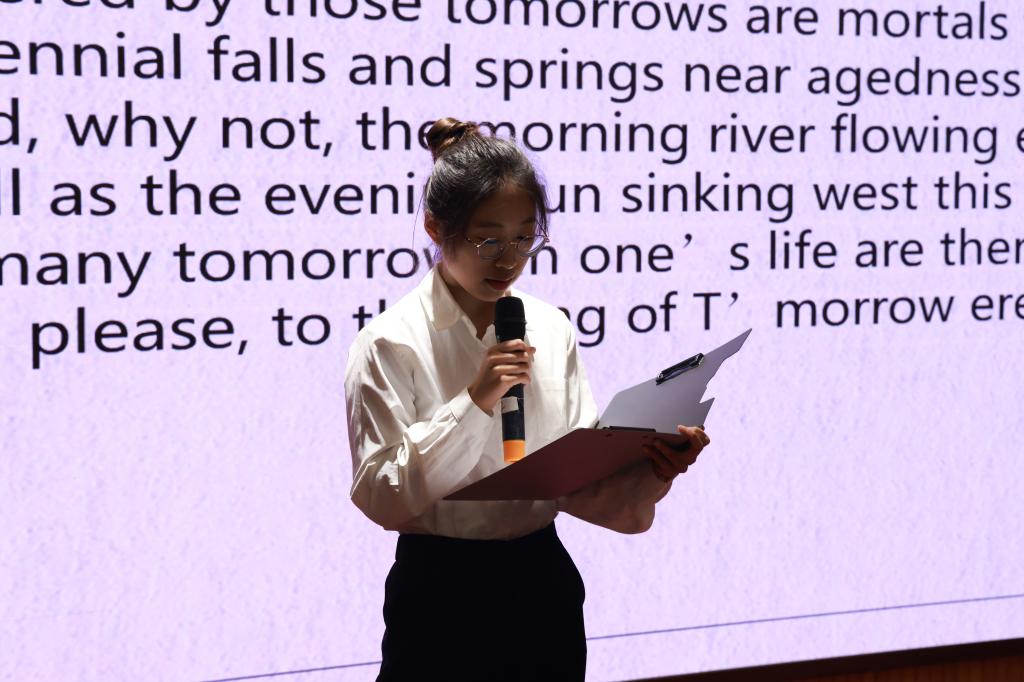 本次大赛选取了重庆工商大学七十周年校庆的宣传标语、中国经典诗词作为翻译材料。译读大会选取了《明日歌》《临江仙·夜登小阁忆洛中回游》《劝学》《浣溪沙·游蕲水清泉寺》四首优秀译作现场诵读展示。“Behold, why not, the morning river flowing east its way.”道出了钱福对时间流逝的感慨;“After twenty dreamlike years I'm still there but feel on edge.”译出了陈与义对年华已逝的叹息。译者的字字句句,将古人的感思融入英语当中,精妙而震撼,给评委和观众留下了深刻的印象。点评环节奉霞老师从翻译作品的韵律和诗歌表意两个方面对选手的翻译水平作出高度评价,史凤晓老师认为选手们的翻译用词比较精准,句子处理比较精妙,努力保证了诗歌的对仗。老师们也建议选手们可以通过参考英文诗歌,通过更加缜密的思考让表达更加精确。