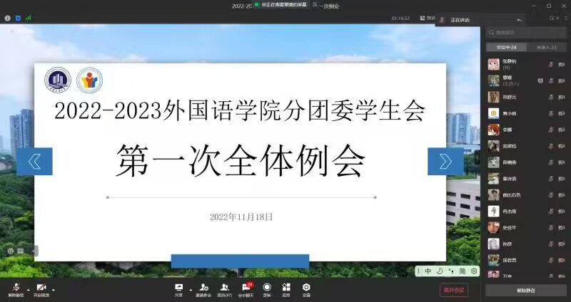 2022年11月18日星期五晚,2138CC太阳集团分团委学生会全体成员例会在企业微信顺利开展。2138CC太阳集团党委副书记吴欢欢、分团委书记周利民,学生会主席团成员及各部门全体成员参加了会议。