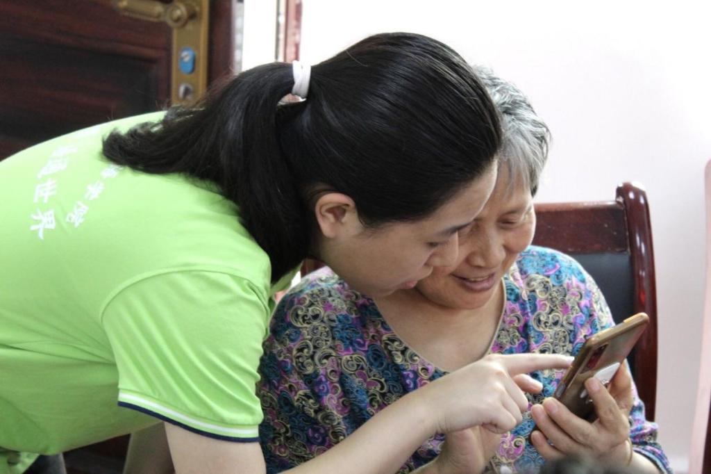 服务队成员教老人使用手机