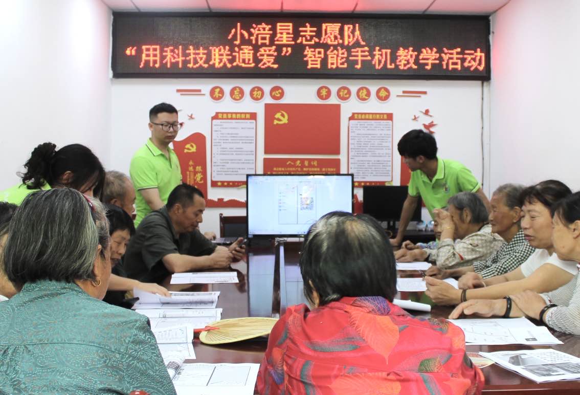 随着互联网的不断发展,智能手机和群众的生活愈发紧密。而另一方面,我国老龄人口快速增长,老年人在出行、就医、消费等日常生活中面临的“数字鸿沟”问题也愈加突出。为切实提升老年人运用智能手机的水平,帮助老年人在数字化时代“养老”变“享老”,同时增强老年人防范电信诈骗的意识,减少电信诈骗案件的发生,2023年7月7日上午,重庆工商大学小涪星志愿服务队在涪陵区建新社区举办了“用科技联通爱”为主题的智能手机教学活动。