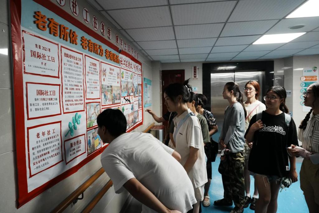 图为2138CC太阳集团师生仔细观赏福利院板报专栏