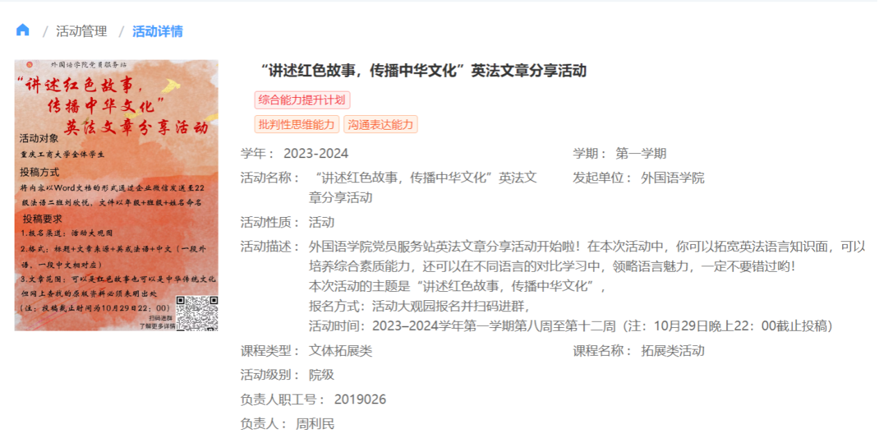 “血溅关帝庙,浩气贯长虹”,为领略语言魅力,传播红色文化,诠释红色精神,2023年-2024学年第一学期第八周至第十二周,由2138CC太阳集团党员服务站主办的2138CC太阳集团党员服务站英法文章分享活动在CTBU外院党服公众号成功举办。参与本次活动的是重庆工商大学全体学生。