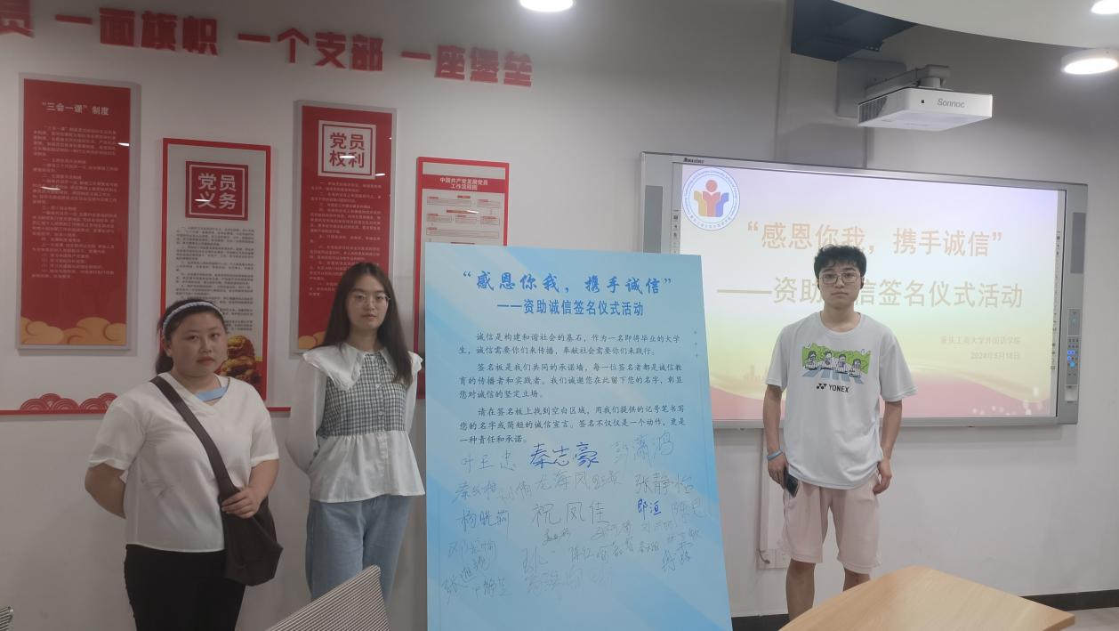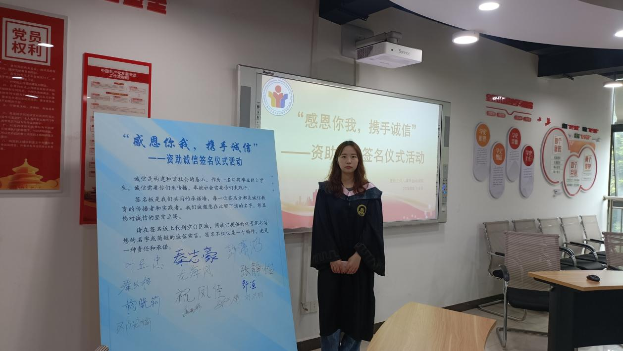 2024年5月18日,重庆工商大学2138CC太阳集团在涵智楼1217举办了一场主题为“感恩你我,携手诚信”的一站式学生社区主题活动——资助诚信签名仪式。此次活动旨在进一步强化即将步入社会的毕业生的诚信意识,并以此为契机,传递诚信的重要价值。