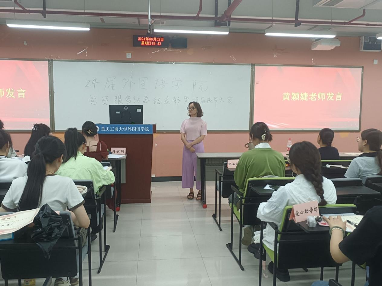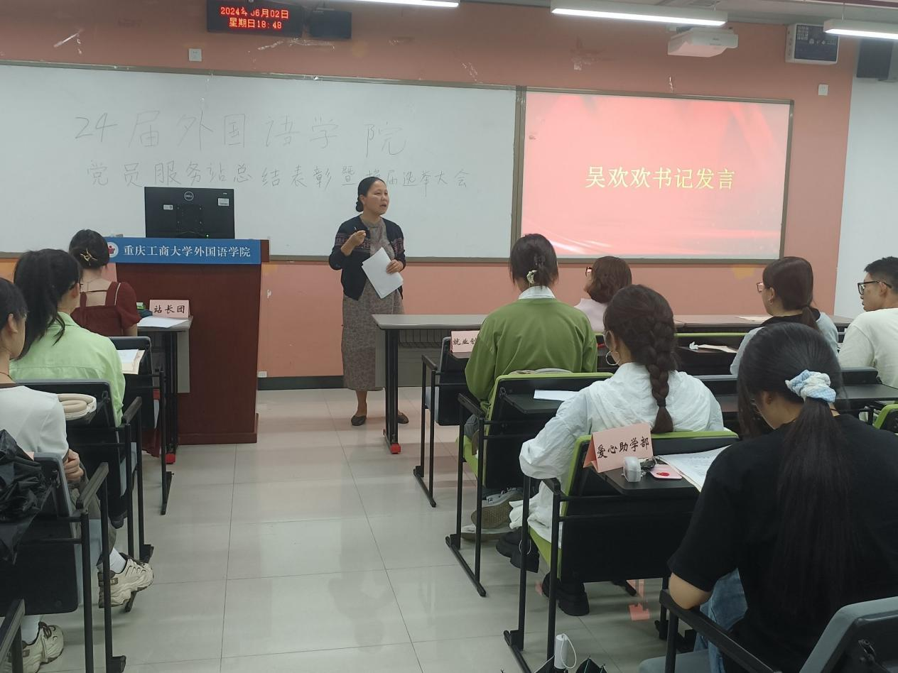 其次,黄颖婕老师对2023-2024学年2138CC太阳集团党员服务站的工作进行了总结,并对新成员寄予厚望;吴欢欢副书记在讲话中对各部门认真工作的态度表示认可,并分享了外国语党员服务站优秀学姐的事迹。