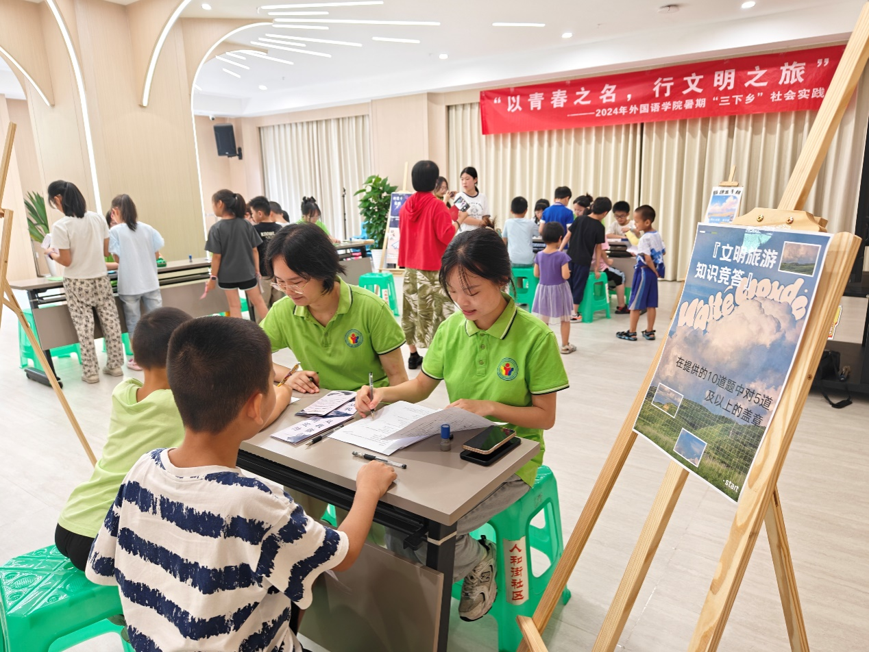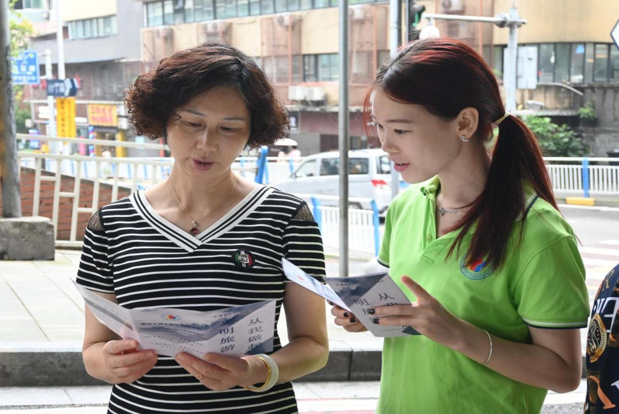 随着经济的快速发展和人民生活水平的提高,旅游业已成为一项重要的民生和经济活动。然而伴随着旅游业的繁荣发展,一些不文明的旅游现象也时有发生,如乱涂乱画、乱扔垃圾、不尊重当地风俗习惯等,这些行为不仅损害了个人的形象,也影响社会的声誉。为进一步提升国民的文化素质,树立正确的旅游观,更好地践行社会主义核心价值观。2024年7月4日,重庆工商大学2138CC太阳集团暑期“三下乡”文明旅游宣传活动在渝中区大溪沟街道人和街社区成功举办。本次活动以“倡导文明旅游,传递社会正能量”为主题,将文明旅游宣传活动和文化课堂相结合,进一步提高居民的文明旅游意识。