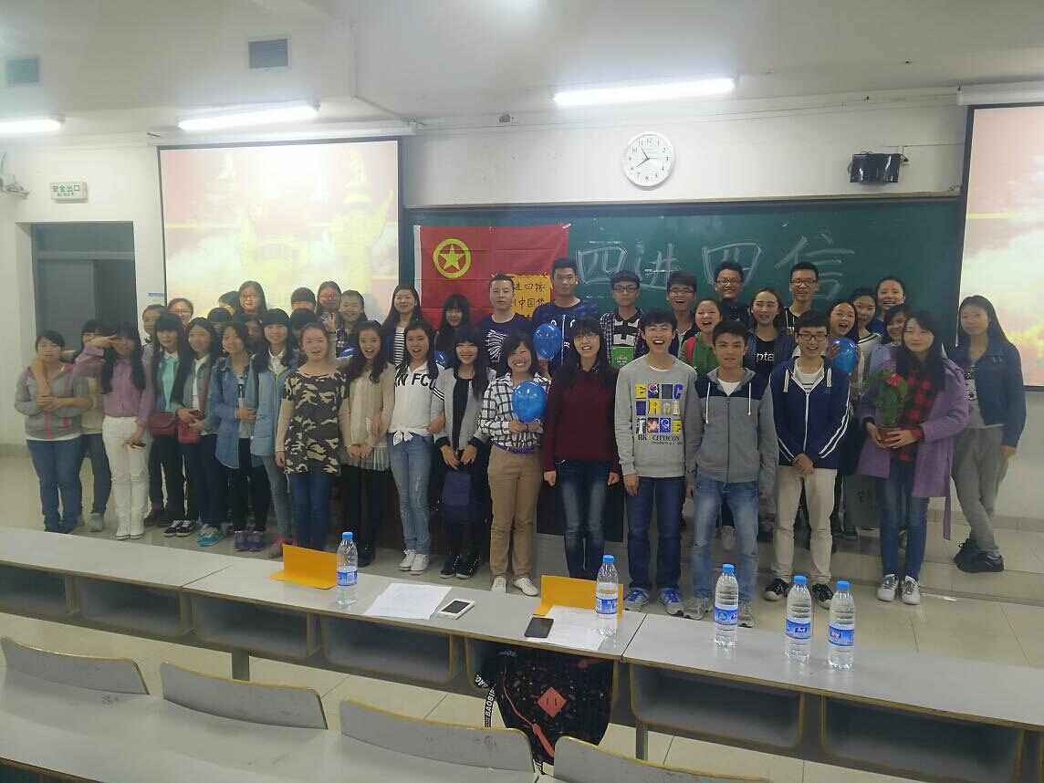 本次团会以“四进四信·共筑中国梦”为主题,弘扬社会正气,学习习近平总书记系列讲话精神,鼓励同学们做一名符合时代要求的有理想、思想端正的优秀共青团员。团会以慷慨激昂的《光荣啊,中国共青团》拉开帷幕;随后,同学们通过一段充满哲理的视频了解了四进四信的含义;紧接着又由高衡和吴爽同学通过一段精彩的ppt向大家介绍了四进四信的详细内容,并与同学们进行了交流互动,使同学们深刻了解了进支部、进社团、进网络、进团课的深层含义。刘银同学带来的一首优美婉转的《军港之夜》,深情的演唱勾起了同学们对海军戍防战士的敬佩之情。将本次团会带入高潮的当属由黄洁、王丽丹、罗川、刘昊同学表演的即兴小品《实现梦想》,不仅给台下的同学们带来了无限的欢乐,同时也用犀利的语言描述了当今大学生创业的现状。蒋勇翔等同学以一首慷慨激昂的《国家》带动了全场,同学们纷纷起立一起合唱。本次团会在全体同学愉快的合照留念中圆满落下帷幕。