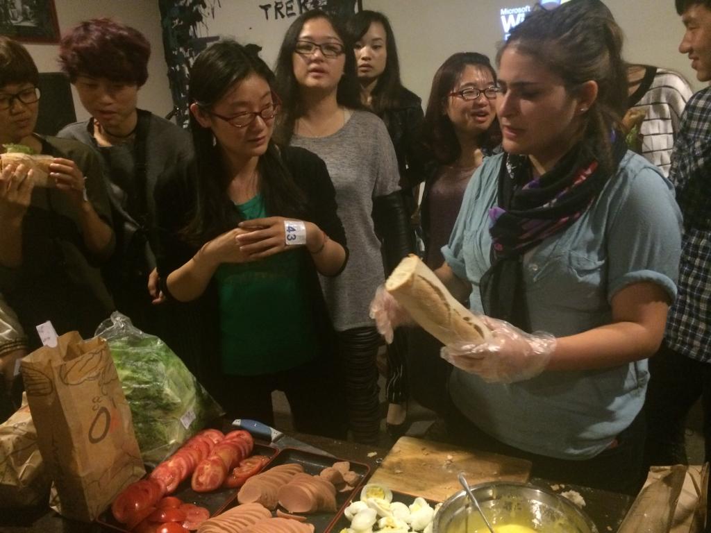 活动现场Cici老师为同学们讲解了法国红酒的相关知识:如何品酒、如何选用合适的酒杯、如何区分红酒产地等;在建筑方面,Cici老师还向同学们介绍了法国著名标志性建筑的历史文化背景。随后,Emma老师现场演示了如何制作简易三明治。现场气氛活跃。最后Cici老师就去法国留学的申请条件、所花费用以及注意事项等为在场的同学进行了详细的讲解。