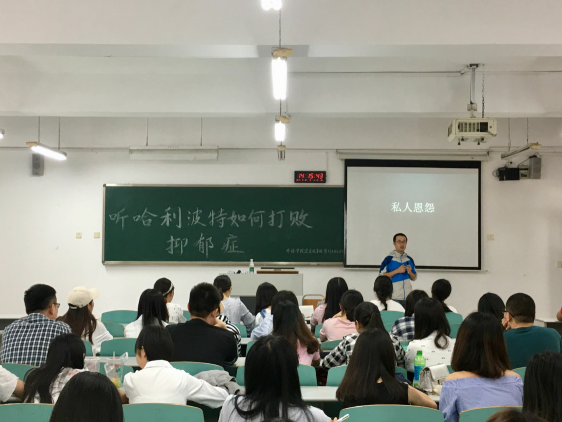 5月12日下午,外语学院党员服务站“文明修身,阳光心理”活动之“听哈利波特如何打败抑郁症”讲座在07104成功举办。本次讲座有幸邀请到了电子图书馆编辑张星老师作为主讲嘉宾,外语学院大一大二各班代表以及党站大部分成员都参加了本次活动。