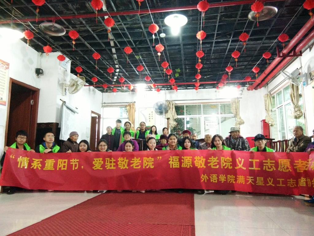 2018年10月13日,由外语学院“满天星”义工志愿者协会主办的“情系重阳节,爱驻敬老院”志愿活动在南岸区福源敬老院成功举办。包括“满天星”义工志愿者在内的20余名志愿者参与了本次活动。
