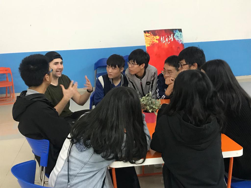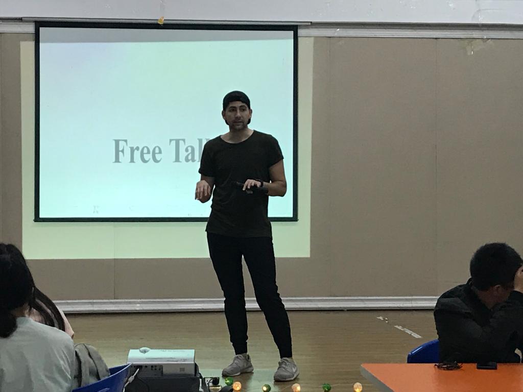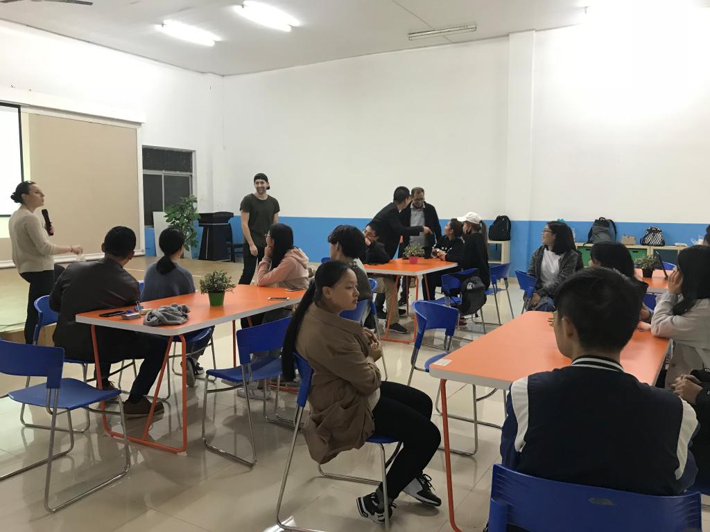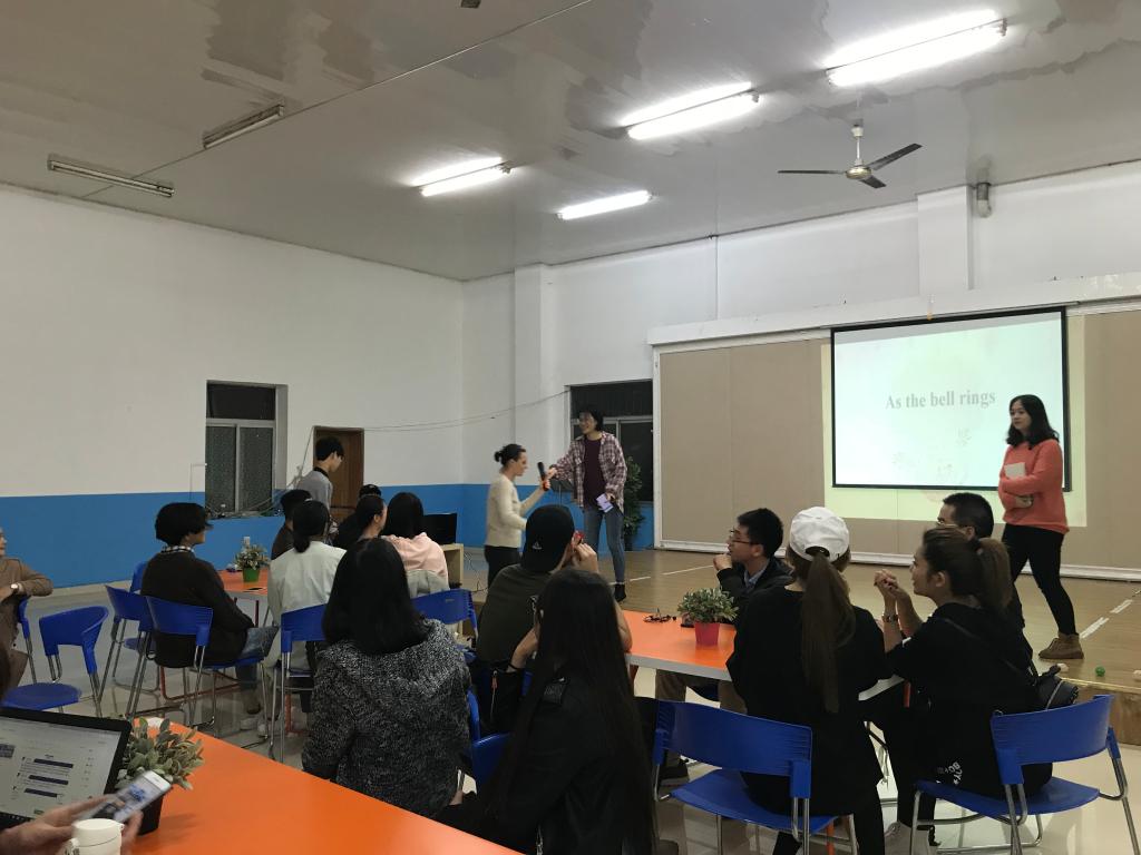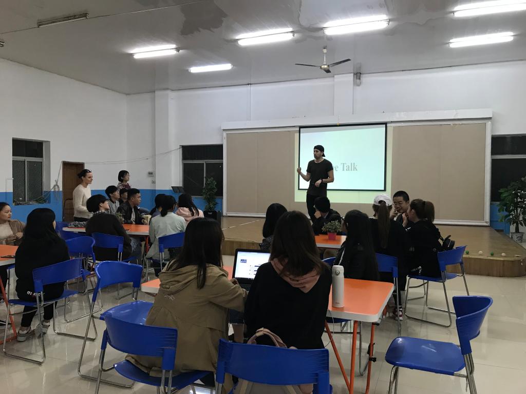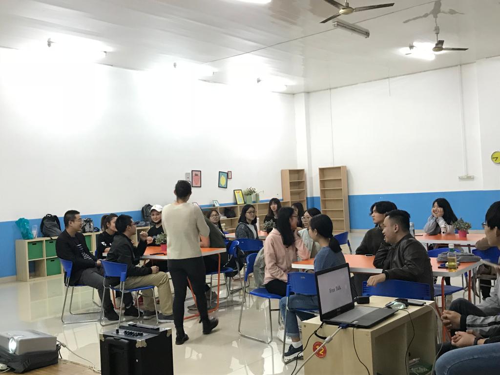 2018年10月16日下午18:40,外语学院满天星义工志愿者协会在南岸校区外语活动中心,准时开展了主题为“课间好时光”的英语角活动。活动由向薇和樊鑫作为主持人,共有三名外教Sam、Brittany和Cameron作为嘉宾以及众多英语热爱者参与。