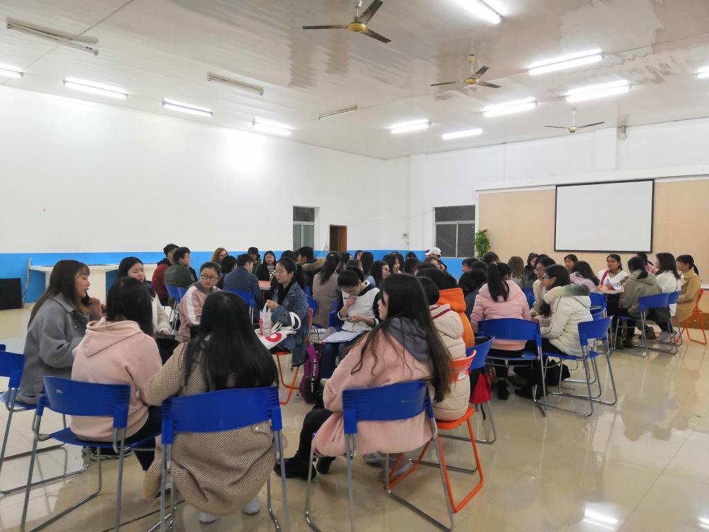 人潮澎湃中,主持人张子豪先向大家分享了自己愉快有趣的寒假生活,引出本次活动主题“Holiholiholiday”。而后文艺部的张海熠同学和素拓部的同学们也分享了关于寒假生活的英语段子,同学们也迫不及待开始了freetalk,分成了八个组分享自己的假期生活,现场气氛十分火热,充满欢声笑语。接下来到了游戏环节,每个组派了一名代表出来参与抢凳子游戏,外教Anne最终赢得了比赛并分享了自己的假期生活,同学们都乐在其中。抢凳子游戏结束后,来到了爱的抱抱游戏,外教Cam所在的组最终失败,并上台合唱了歌曲。最后,大家一起拍了合影。