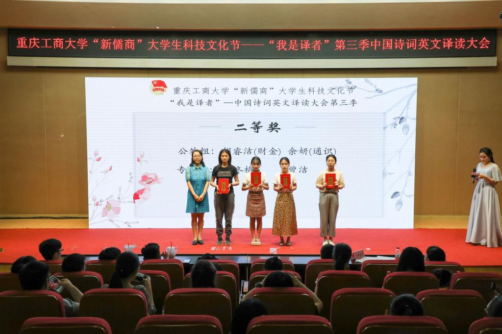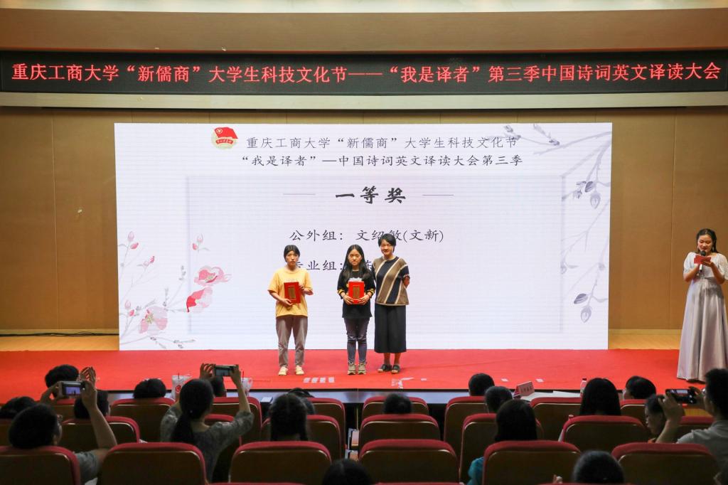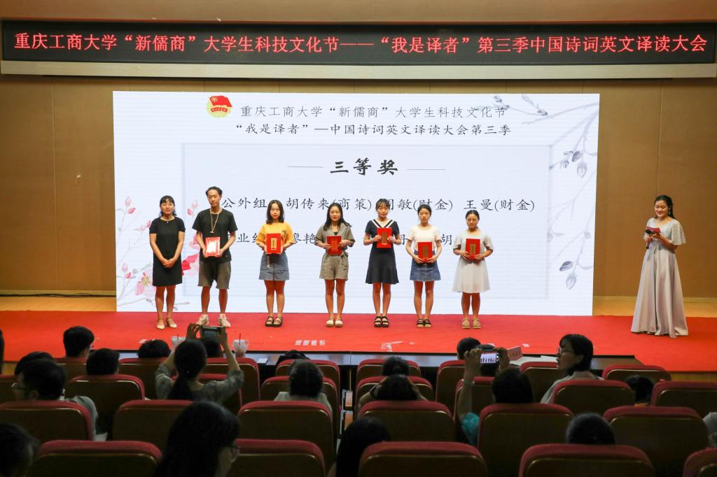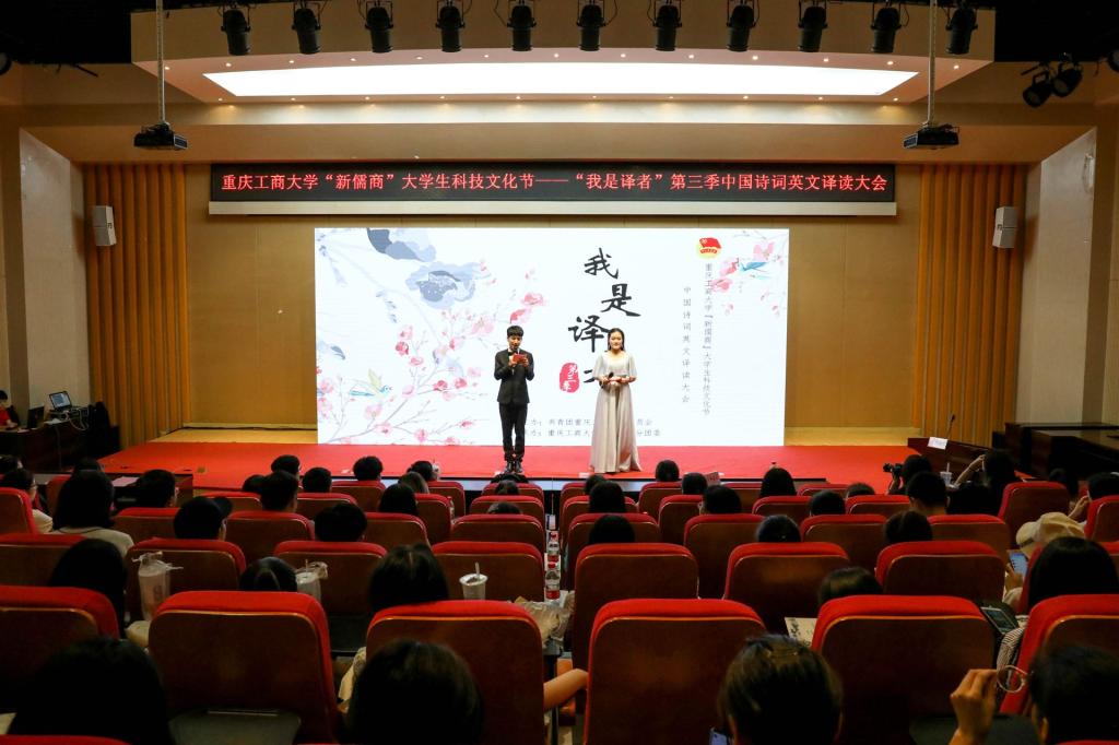 2019年4月26日,由共青团重庆工商大学委员会主办、外语学院分团委承办的重庆工商大学“新儒商"大学生科技文化节之“我是译者”第三季中国诗词英文译读大会在田家炳209报告厅成功举办。重庆工商大学校团委陆嘉副书记、外语学院周琳副院长、外语学院党总支程亚副书记、外语学院学团办主任吴欢欢老师、财政金融学院分团委书记徐阔老师、外语学院分团委书记黄志婕老师、外语学院丁亮老师、评委代表骆萍老师出席了本次活动。同时,外语学院刘勇老师也作为特邀点评嘉宾参加了活动。