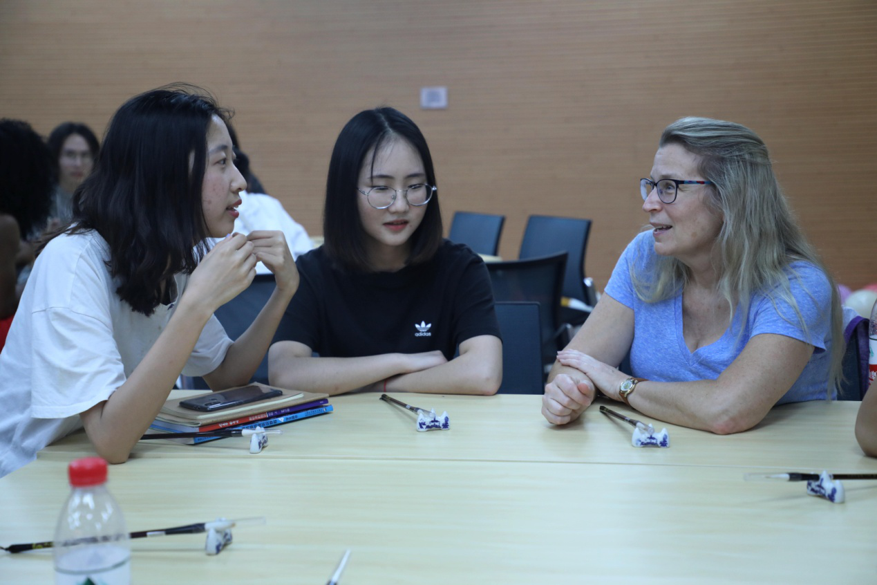 第二个互动话题是偶像,史凤晓老师依次介绍了程颐和杨时、游酢;斯蒂芬·茨威格和保尔·魏尔伦;威廉·华兹华斯和约翰·弥尔顿三组老师与学生的故事,讲述了他们对于自己偶像——导师的尊敬。讨论过程中,主办及承办单位还为参与者们提供了甜点及饮品,热烈的讨论和欢愉的零食将英语沙龙的活跃气氛烘托到最高点。讨论时间一结束,大家便迫不及待分享了自己生活中或是学术上的偶像,并表明了向偶像学习的决心。活动最后,主办及承办单位还为外教、留学生们准备了代表中国传统文化的毛笔作为礼物,以此寄予友谊地久天长,文化交流繁荣的愿景。