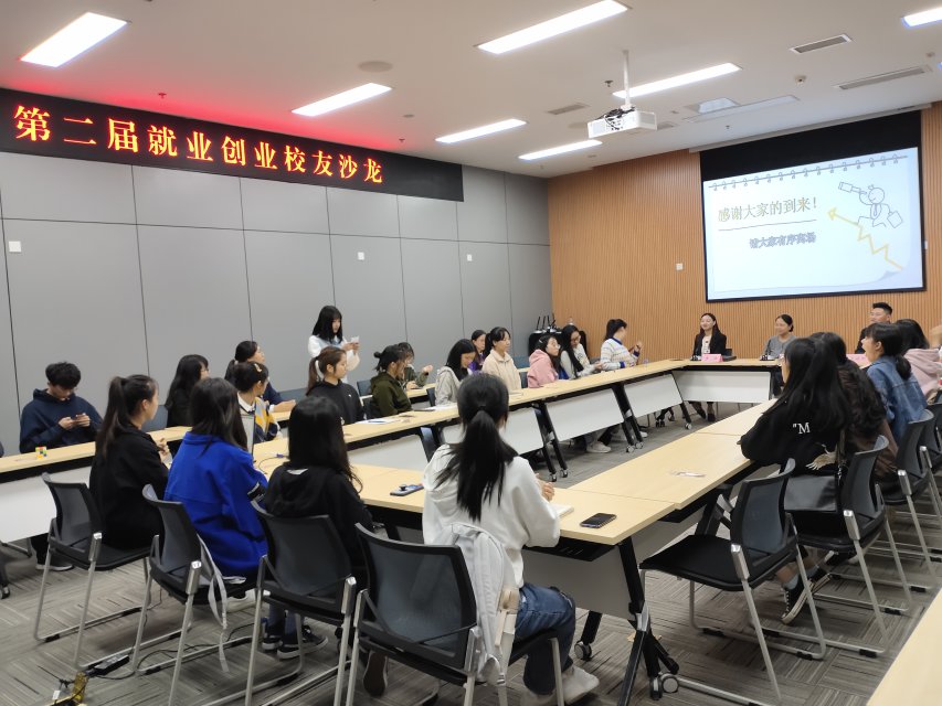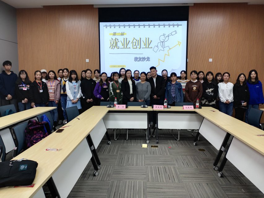 随着主持人介绍出席本次活动的老师、嘉宾,活动正式开始。本次活动共分为三个环节,首先,10级英语系校友龙俊帆就英语专业类学生择业方向做了详细讲解,根据自身工作经历,他列举了多个不同实例,展现了不同选择的不同发展平台及机遇,分享了赴非洲工作的相关体会与认识以及赴非就业的优势,并指出,外语类学生不应对在非洲工作产生偏见与担忧,要正确认识赴非就业的机遇。06级经贸英语系校友李倍从一个公司人力资源管理者的角度出发,详细介绍了企业对于招聘员工的倾向,分享了个人求职经历,强调了情商的重要性,提出求职要选择好第一份职业,不要频繁跳槽,要根据自身性格等条件来择业等建议,并解答了学弟学妹的相关疑问。最后,学生工作办公室主任吴欢欢老师对本次活动进行了总结,她指出,学生在校期间要重视职业生涯规划课程,切实做好自我的职业规划,多参与社会实践活动来丰富认知,增长经验,提高自身综合素质,为就业做好充分的准备。最后,活动全体参与人员进行合影留念。