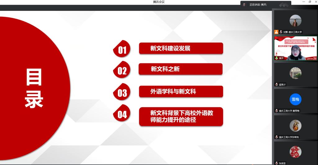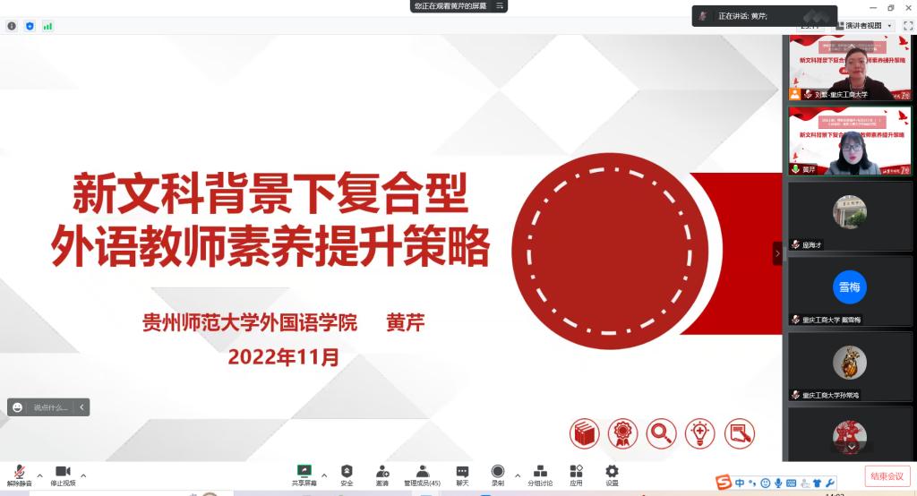 2022年11月25日下午,2138CC太阳集团邀请优秀校友黄芹在腾讯会议上做了题为《新文科背景下复合型外语教师素养提升策略》的教师素质提升讲座。本次讲座是2138CC太阳集团献礼我校七十周年校庆的系列讲座之一。会议由2138CC太阳集团副院长刘繁主持,2138CC太阳集团全体专任教师参加了线上讲座。
