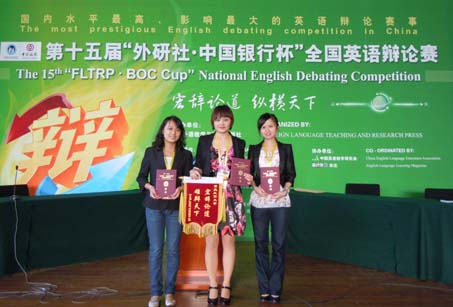 我校辩论队由英语专业学生杨娇和杨馨两位同学组成,英语系主任黄缅博士带队。5月7日,我院辩论队代表重庆工商大学赴北京,参加了为期7天的第十五届“外研社”杯全国大学生英语辩论赛。由于该项比赛水平高、影响大,一般只有名牌高校和重点大学组队参赛,如北大、清华、浙大、北外、广外、复旦等等。本届比赛共有来自全国各地的129所高校参加,真可谓强手如林。我校辩论队来到北京大兴的第二天就进入了组委会安排的紧张的赛前培训。在为期两天的培训中,我校辩手和指导老师努力准备,认真学习,及时将学到的新知识和辩论技巧运用于战术设计中。通过热身赛,黄缅博士带领我校两名辩手不断总结经验和教训,尤其是热身赛中出现的问题让我校辩论队不仅倍感压力,更明确了努力的方向和路径。凭借坚实的语言基本功,我校辩论队的两名选手在热身赛中迅速成长,为随后的正式比赛奠定了良好的基础。第三天,比赛正式开始,组委会每天安排3场辩论赛,节奏快,时间紧,但我校辩论队充分准备,沉着应战,全身心地投入到了异常激烈的比赛中。黄缅博士充分利用赛前有限的30分钟准备时间,与两位辩手一起讨论,分析辩题、设计思路、选择策略、组织语言,将整个过程安排得井井有条,显示出了我校辩论队崇高的团队精神。在赛场上,我校辩论队不畏强手,与来自全国各大高校的辩手一争高下,充分展示了自己雄辩的口才、熟练的英语口语、辩证的观点、开阔的视野、广博的知识。在循环赛中,每一场比赛都异常激烈,每一场战斗也打得异常艰难。每天的比赛结束后,指导老师和辩手们不顾比赛的疲惫,认真总结当天的比赛,在挖掘成功经验的同时也及时发现问题并努力改进。正是指导老师和辩手们的顽强拼搏,我校辩论队在本届比赛中取得了骄人的成绩。这不仅充分展示了我校英语专业不俗的教学水平和教学效果,而且也在全国性的大型比赛中为重庆工商大学增添了一份殊荣。