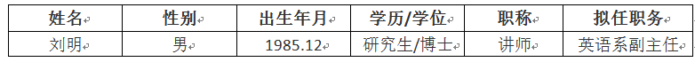 因学院工作需要,在英语系中遴选英语系副主任1名,经2024年2月28日学院党政联席会研究,决定拟聘刘明老师担任英语系副主任(院聘)。现予公示。