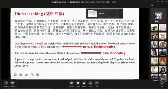 刁老师的讲座以《射雕英雄传》英译本为例,探讨功夫电影如何在认识论、审美、及技术层面影响武侠小说的翻译,指出译者在翻译过程中受到徐克电影的启发,译者跨符际地挪用了减速拍摄 (undercranking)、快速镜头(fast cutting)、放大拍摄(zoom in shot)和超长镜头(extreme long shot)等技巧,以增强译文的画面感和节奏感,提升译文对英语世界大众读者的吸引力。