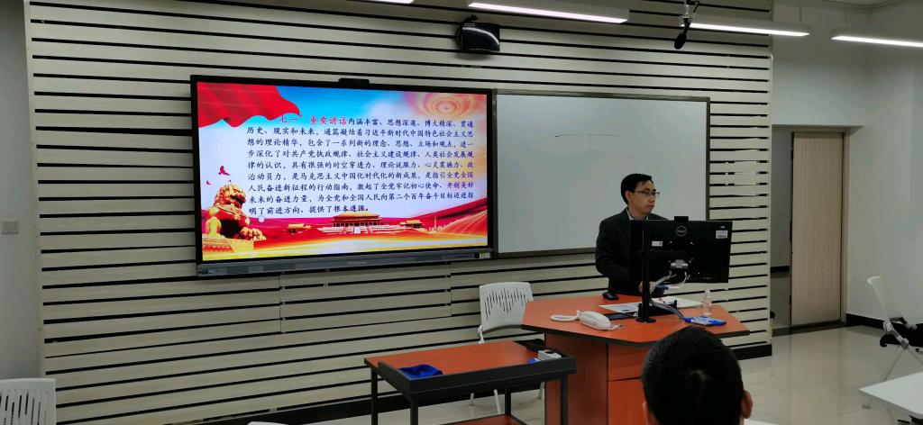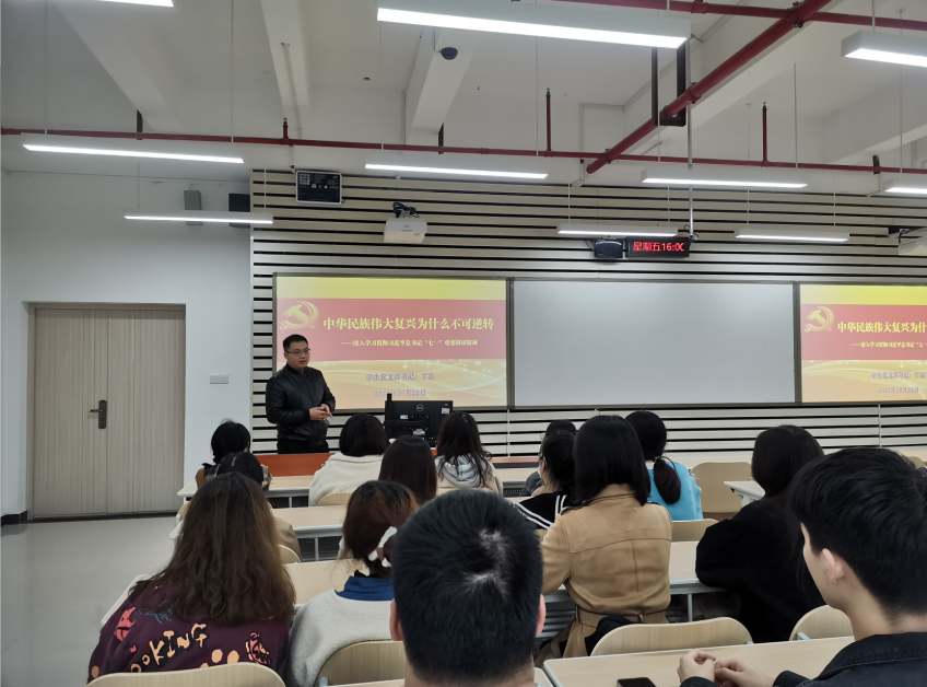 学生党支部书记丁亮老师在涵智楼1104教室为发展对象讲授了学习贯彻习近平总书记“七一”重要讲话精神专题党课。丁亮老师告诫同学们,中国共产党成立100年来,开创了一个又一个的伟大成就,开创了中国式的现代化道路,开创了人类文明新形态,为新时代的中国青年提供了巨大舞台与空前机遇,希望同学们树立担当意识,发扬实干精神,义不容辞地肩负起实现中华民族伟大复兴的重任,做无愧时代、无愧青春的追梦人,努力成为担当民族复兴大任的时代新人。