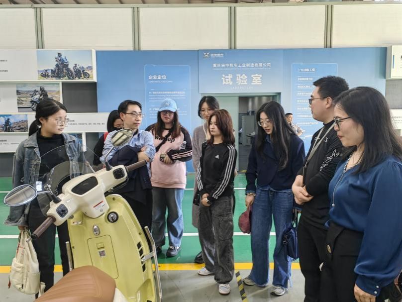 会谈结束,在公司同事的带领下,同学们走进宗申机车的摩托车生产车间,近距离学习和观察了机车的生产流程。同学们尝试摩托车几百个零部件的现场翻译,罗老师和外贸业务员进行现场辅导。从总装线到包装线,再到智能检测区,通过实地参观,同学们不仅加深了对机车制造工艺的认识,还掌握了相关专业术语的准确翻译,进一步提升了自身的翻译实践能力。