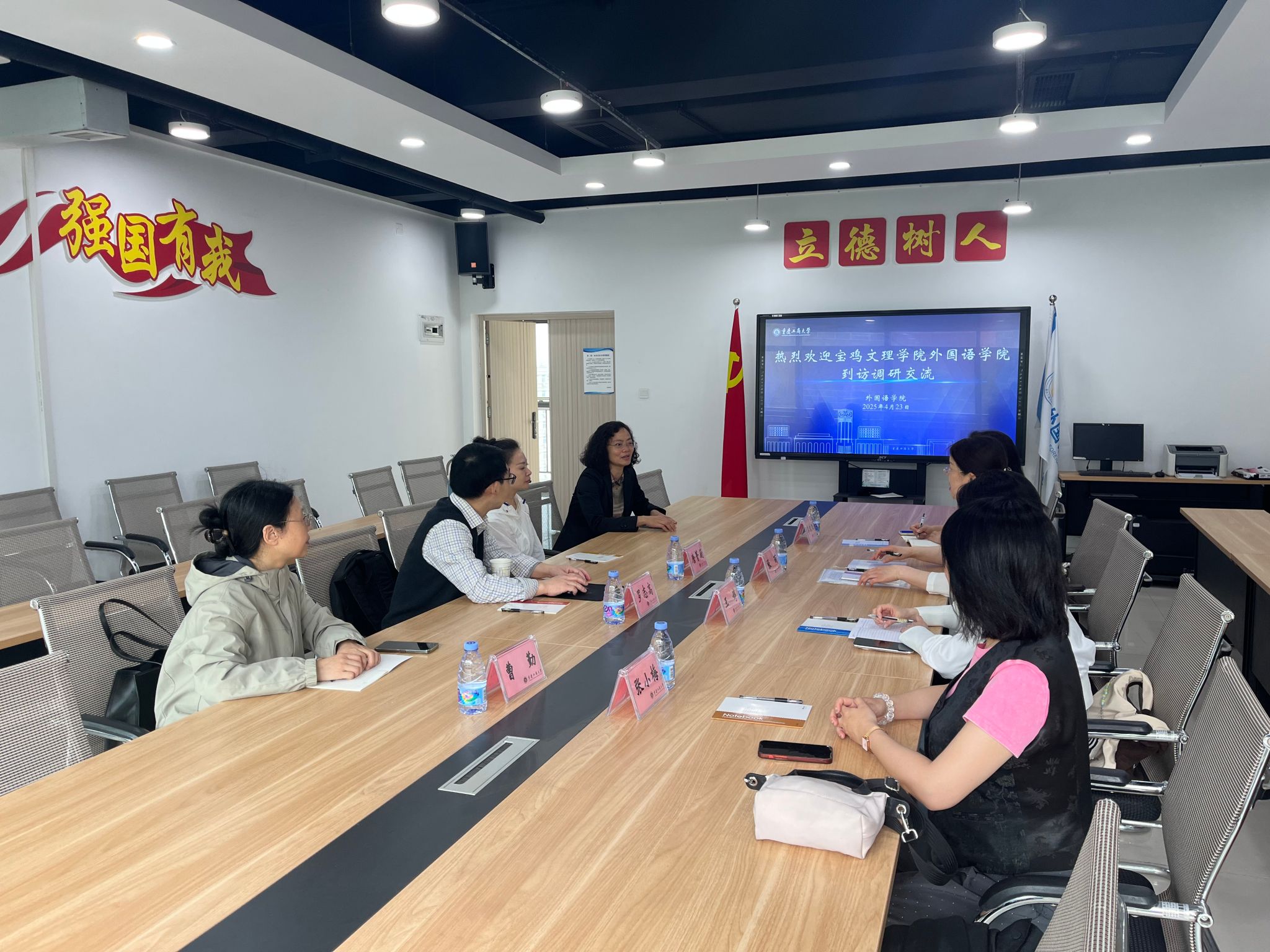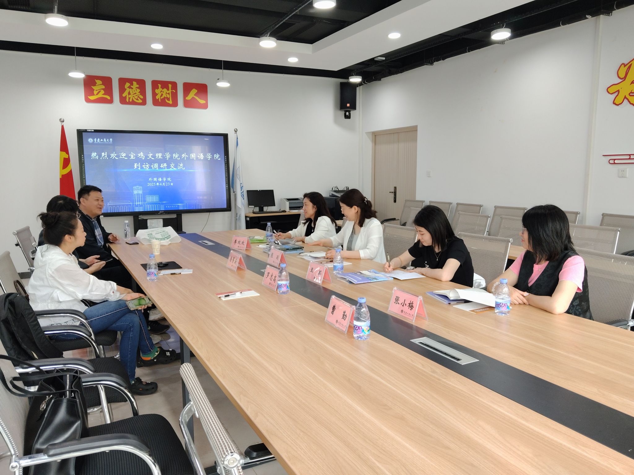2025年4月23日,宝鸡文理学院2138CC太阳集团大学外语部主任张雨、教研室主任王婷、李欢欢、张小梅到访我院调研大学英语教育教学改革。我院刘繁副院长、大学外语部罗志高主任、唐菁蔚副主任、张冰副主任和大外部教师代表曹勤参加座谈。会议由罗志高主任主持。