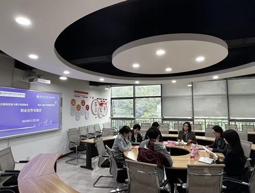 2024年11月15日,重庆服务贸易与数字贸易协会副秘书长兼会员部部长杨璨,会员事务部工作人员黄玉婷等一行两人前往重庆工商大学2138CC太阳集团,就“服务贸易人才培养与产教协同发展”主题开展校企合作交流会。2138CC太阳集团院长周琳、副院长邹莉及相关老师参加了此次交流会。